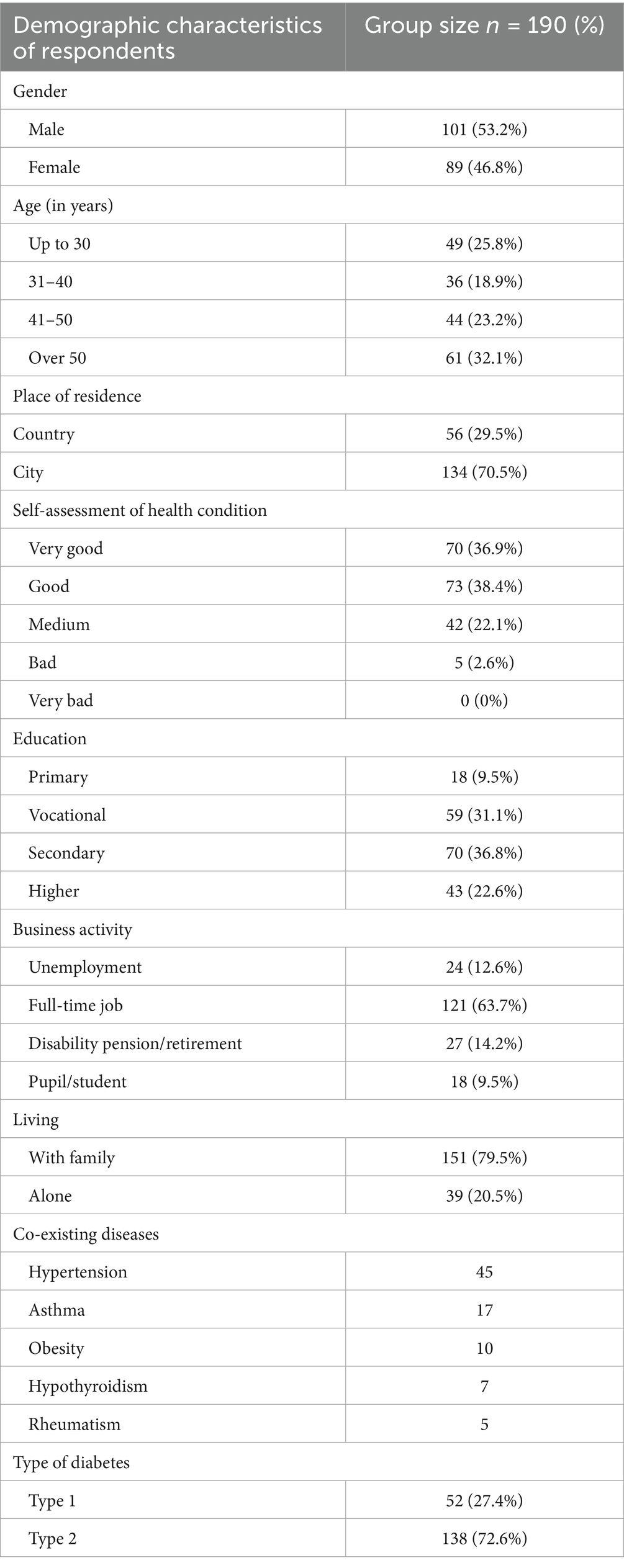 The general characteristics of the study population are presented in Table 1. The study involved 190 individuals, including 101 female and 89 male patients. The mean age of the participants was 42.2 ± 13.4 years: 41.3 years ± 13.9 for female patients, and 43.2 years ± 12.9 for male patients. The largest group of respondents had a secondary education (36.8%), while the smallest group had a primary education (9.5%). Among the respondents, 63.7% were employed. One-fifth of the patients (20.5%) lived alone. Among the study participants, 72.6% had type 2 diabetes. The mean time since the diagnosis of diabetes was 7.7 ± 5.7 years. In the study population, 87 patients (45.8%) declared the presence of coexisting diseases. When answering the question about the type of coexisting diseases, respondents were allowed to select more than one statement. Thus, a total of 122 responses were registered from 87 individuals. The most commonly reported coexisting conditions were hypertension (36.9%), followed by asthma (13.9%), obesity (8.2%), hypothyroidism (5.7%), and rheumatism (4.1%).