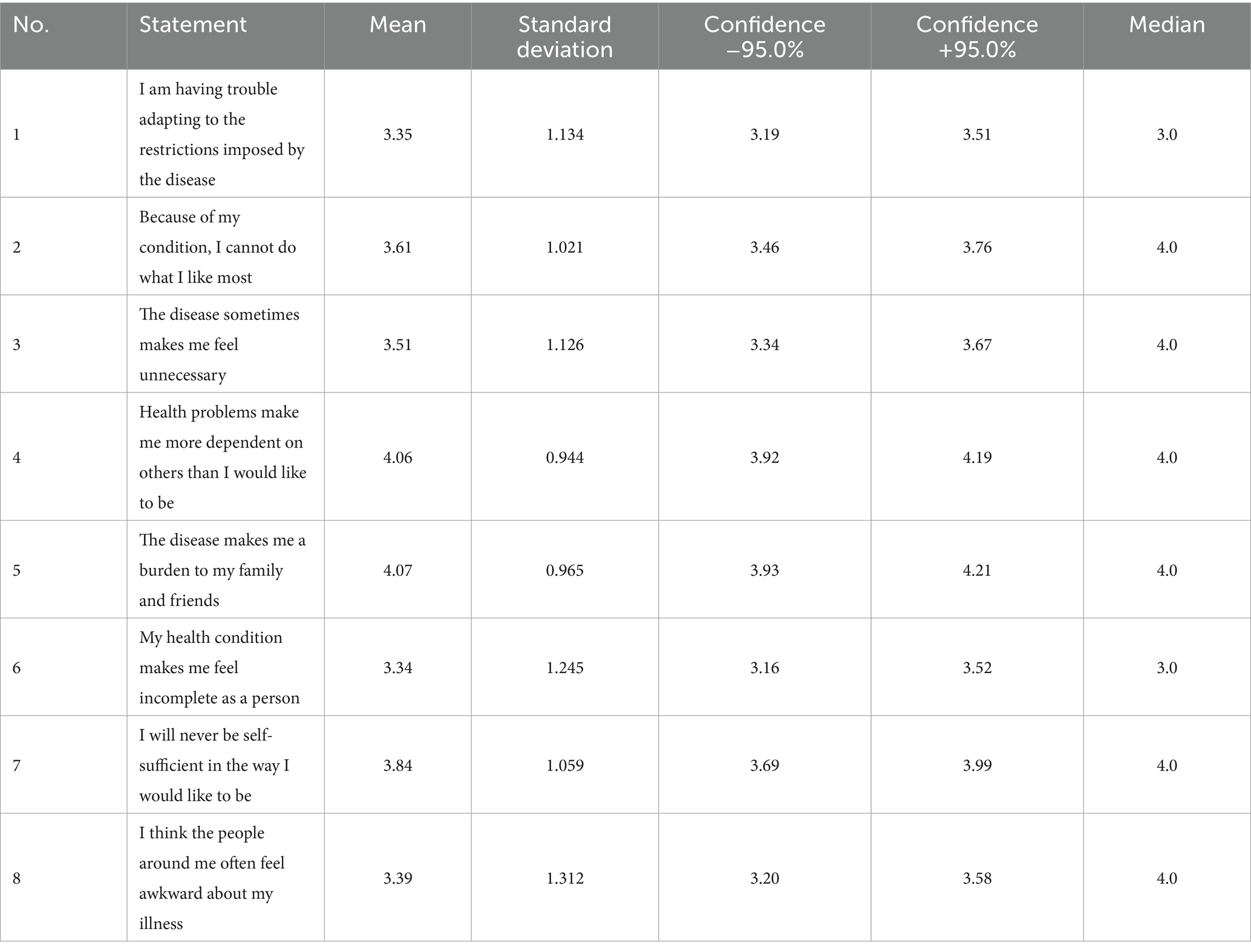 Table 2 presents the mean values for individual statements on the Acceptance of Illness Scale, ranging from 3.34 to 4.07 points. The lowest average, and thus the lowest level of illness acceptance, was obtained for the statements: “My health condition makes me feel incomplete as a person” (3.34 points) and “I am having trouble adapting to the restrictions imposed by the disease” (3.35 points). The highest average, and consequently the highest level of acceptance of illness, was scored for the statements: “The disease makes me a burden to my family and friends” (4.07 points) and “Health problems make me more dependent on others than I would like to be” (4.06 points).
