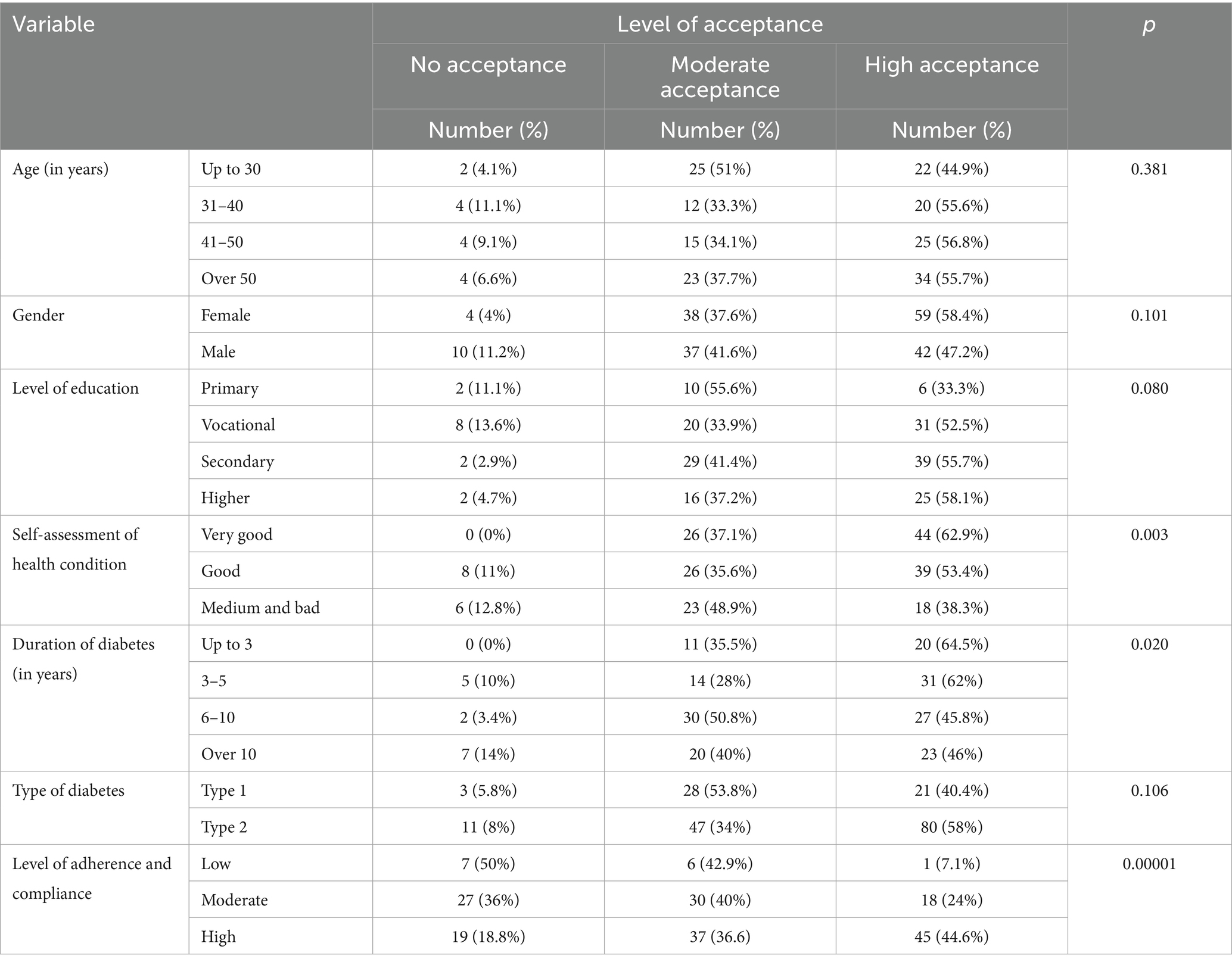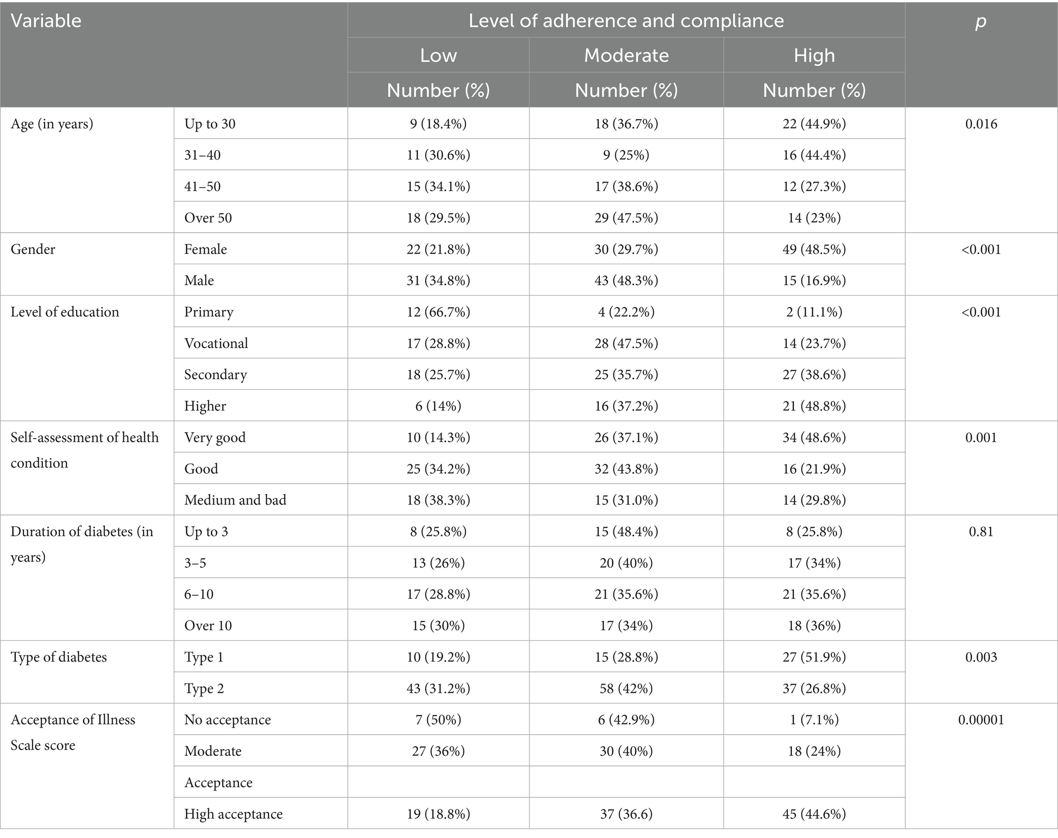 In the present study, it was found that patients with diabetes exhibited a moderate level of adherence and compliance and a high level of acceptance of illness. Patients who accepted their diabetes tended to demonstrate better self-care and adherence to medical recommendations. Higher education of patients correlated with a greater level of acceptance of illness and better adherence to medical recommendations. Patients with type 1 diabetes showed a higher level of adherence to recommendations than those with type 2 diabetes, which may result from intensive education on insulin therapy.
