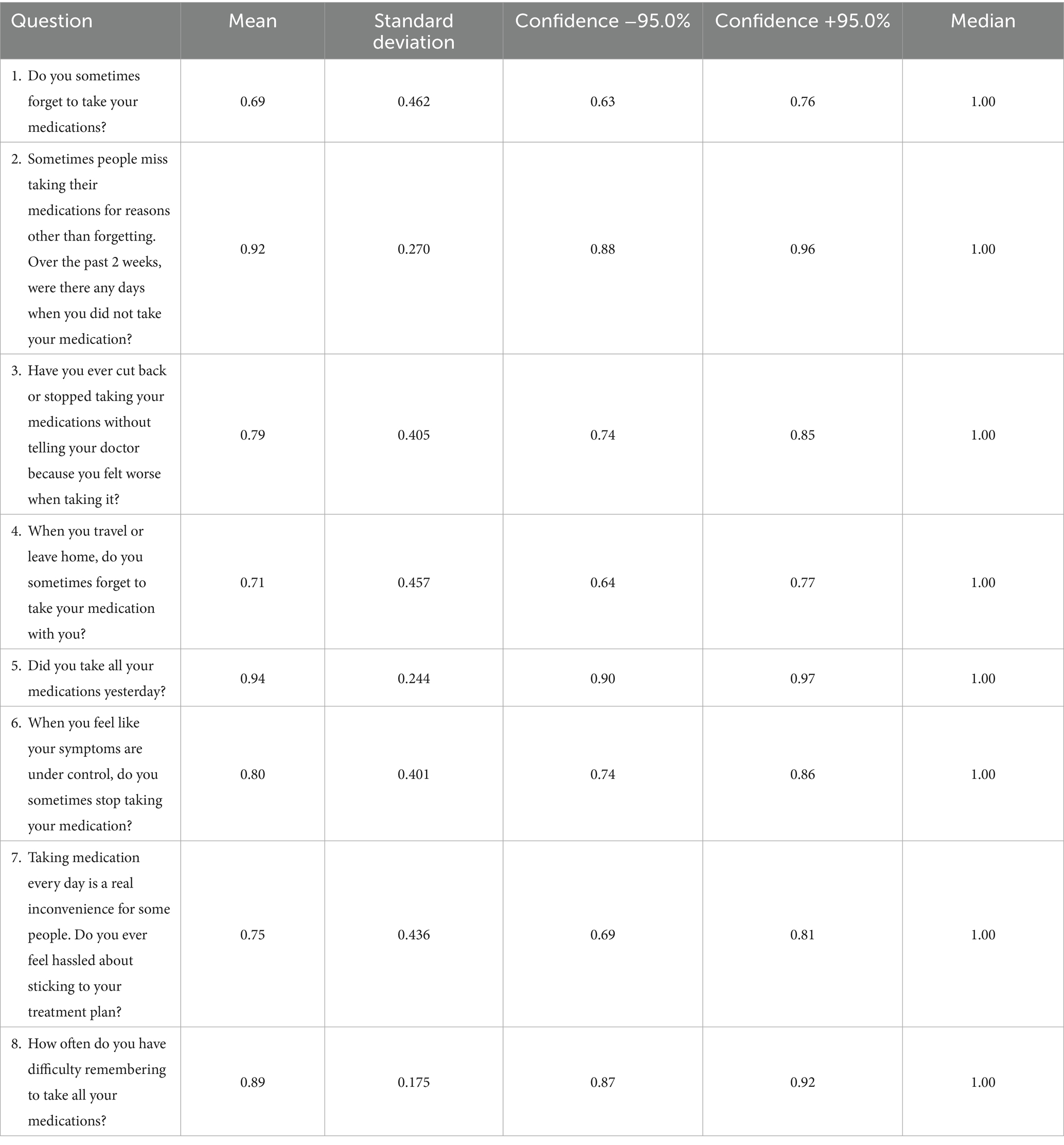 Among all items assessing medication adherence, the highest average score was given to question 5: “Did you take all your medications yesterday?” (0.94 points). This was followed closely by question 2: “Sometimes people miss taking their medications for reasons other than forgetting. Over the past 2 weeks, were there any days when you did not take your medication?” (0.92 points) (Table 4 for detailed responses).
