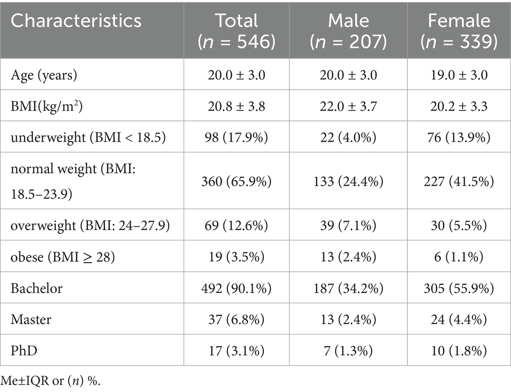 Table 1 displays the descriptive characteristics of the university student sample in this study. A total of 546 participants were included in the final analysis, with a median age of 20.0 ± 3.0 years and a median body mass index (BMI) of 20.8 ± 3.8 kg/m2. Among them, 339 were female (62.1%) and 207 were male (37.9%). Based on BMI classification, 98 participants (17.9%) were underweight, 360 (65.9%) had normal weight, 69 (12.6%) were overweight, and 19 (3.5%) were obese.