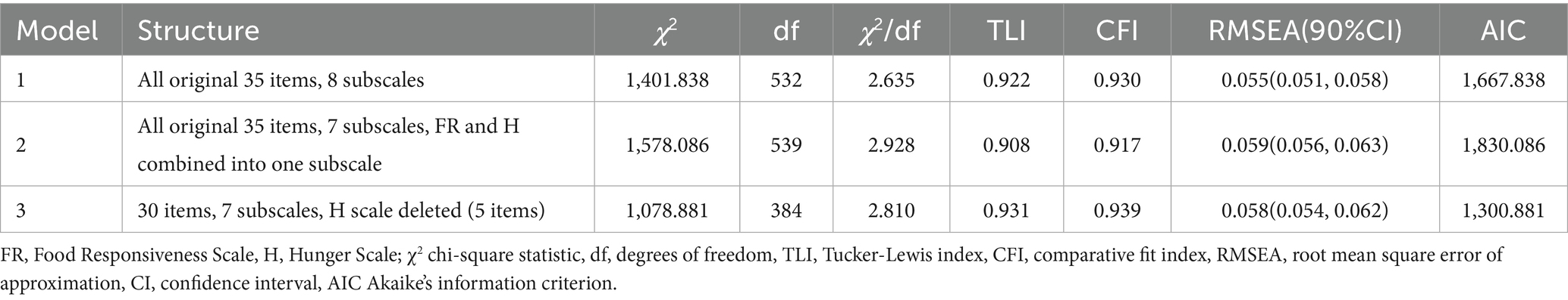 Confirmatory factor analysis was conducted using Structural Equation Modeling (SEM), which tested the fit of data from three alternative models based on the findings of Hunot et al. (21). Model 1 included all original 35 items and 8 subscales; Model 2 included all 35 items and 7 subscales, combining Hunger and Food Responsiveness into a single subscale; and Model 3 included 30 items and 7 subscales, deleting the Hunger subscale (5 items). Model fit was assessed using the following indices: chi-square statistic (χ2), degrees of freedom (df), Comparative Fit Index (CFI), Tucker Lewis Index (TLI), and Root Mean Square Error of Approximation (RMSEA). When χ2/df < 3, CFI and TLI values>0.90 (35), and RMSEA ≤ 0.06 (36), it indicates that the model fits well. The parsimony of alternative models was assessed using Akaike’s information criteria (AIC) to select the best-fitting model, where smaller values indicated a more parsimonious model (37). Statistical significance was set at p-values <0.05.