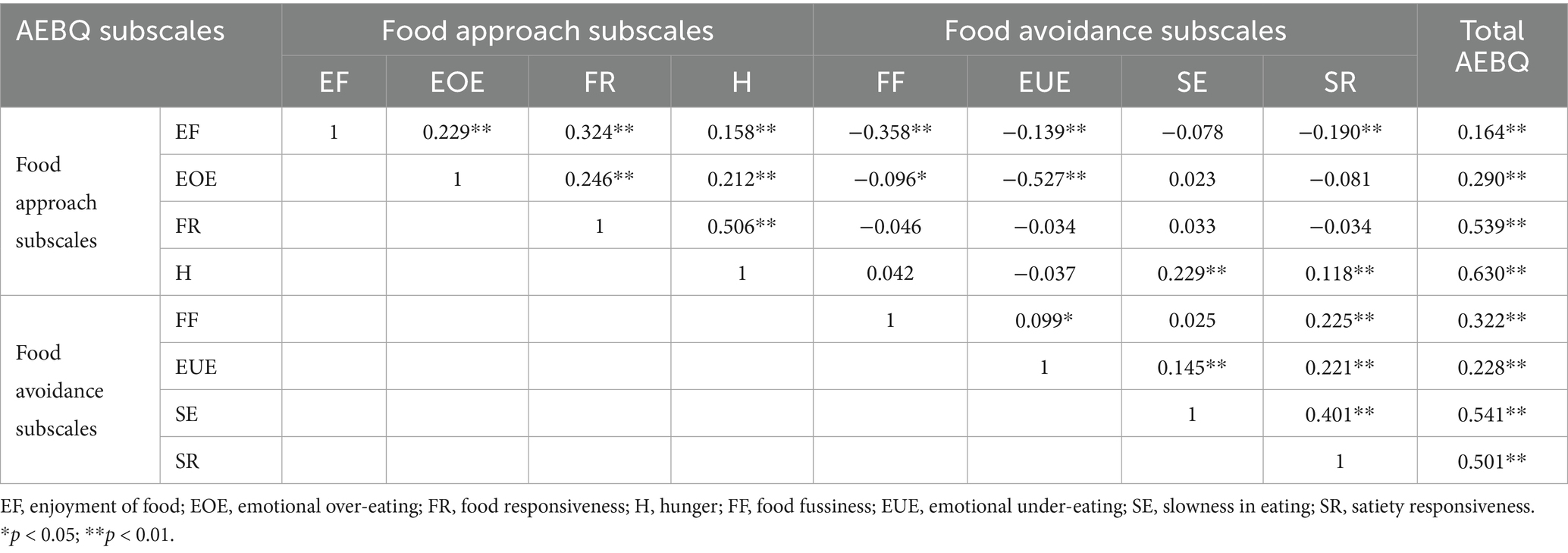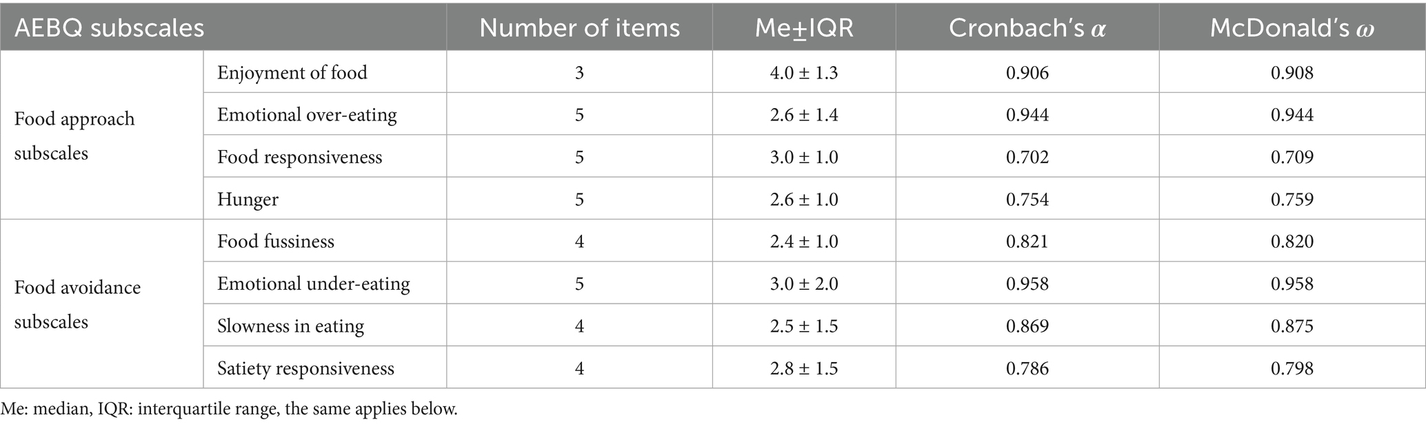 Descriptive statistics and reliability evaluation were conducted on the AEBQ scale. Internal consistency of the AEBQ was assessed using Cronbach’s alpha (α), and Cronbach’s α greater than 0.70 was considered a good measure of consistency for each appetitive trait (38). McDonald’s omega coefficient (ω) was also calculated to eliminate potential errors in internal consistency estimation (39). Spearman correlation analysis was used to examine the relationships between the AEBQ scales, as well as the relationship between appetitive traits and BMI. Statistical analysis was performed using IBM SPSS V.27, and structural equation modeling was completed using IBM SPSS AMOS V.28.