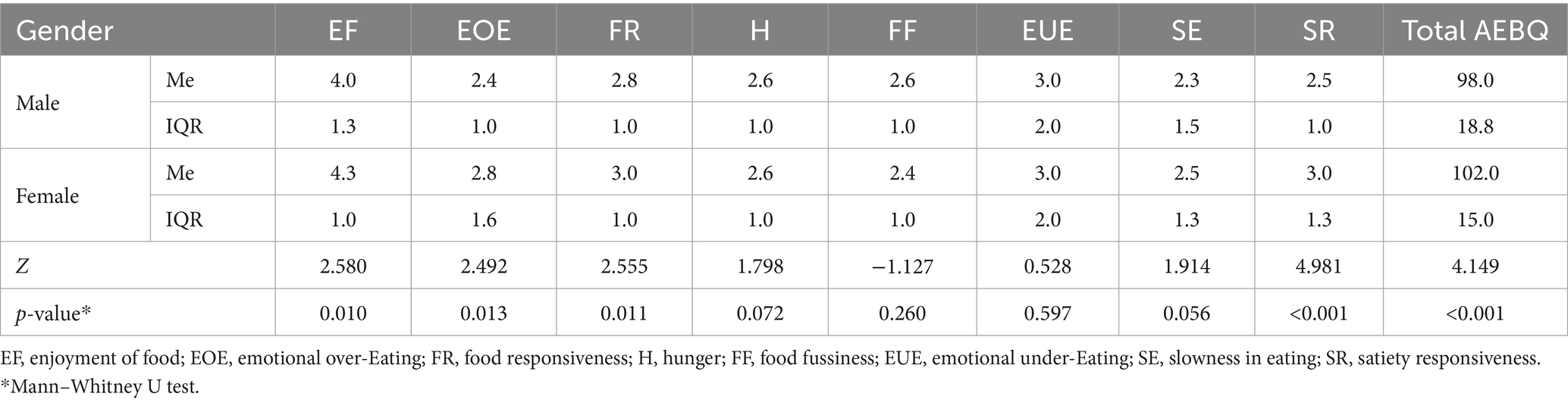 When comparing gender differences, the present study observed that females scored significantly higher than males on EF, EOE, FR, and SR, with higher total AEBQ scores. These findings are consistent with findings from previous populations, such as Polish adolescents (42) and UK adolescents (22), where females also showed stronger emotional and external eating tendencies. The underlying mechanisms may involve both behavioral and biological factors. Behaviorally, females tend to eat more slowly and chew more thoroughly (43), which enhances awareness of internal satiety cues and may partly explain their higher SR scores (44). From a neurobiological perspective, functional neuroimaging studies indicate that females exhibit heightened neural reactivity to food cues, particularly in craving- and taste-related brain regions like the anterior insula and orbitofrontal cortex, with enhanced responses under food deprivation (45, 46). Additionally, hormonal fluctuations across the menstrual cycle, such as increased progesterone during the luteal phase (47), may also amplify emotional eating tendencies in females (48).