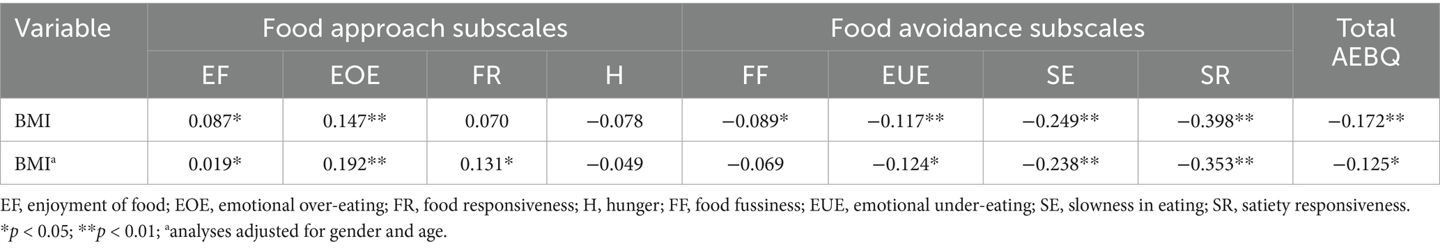 An imbalance between energy intake and expenditure is a key determinant of obesity (6). Eating behavior—an important factor influencing energy intake—plays a critical role in human growth, development, and the onset of chronic conditions such as obesity (7, 8). Appetitive traits describe stable tendencies toward food approach or avoidance, reflecting how individuals respond to internal cues (e.g., hunger, satiety, emotions) and external cues (e.g., food availability or sensory appeal) (9). These traits differ across individuals and are shaped by both genetic and environmental factors (10). Individuals with stronger food-approach traits tend to overeat and gain weight, whereas those with stronger food-avoidance traits tend to maintain a lower BMI (11). In addition, certain appetitive traits seem to be risk factors for eating disorders-related diseases. There is a positive correlation between food approach behaviors (food enjoyment, hunger, emotional overeating, and food responsiveness) and symptoms of food addiction (FA) (12) Selective or “picky” eating (13) and satiety response (14) are associated with avoidance/restrictive food intake disorder (ARFID).