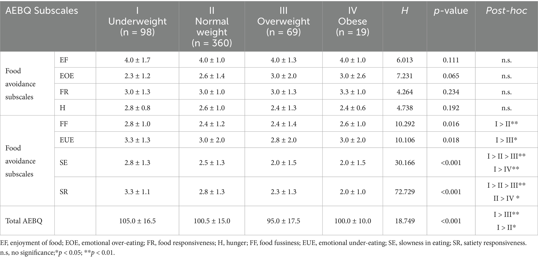 Table 7. Results of intergroup comparisons of AEBQ subscales scores across BMI categories using the Kruskal–Wallis H test and post hoc analysis.