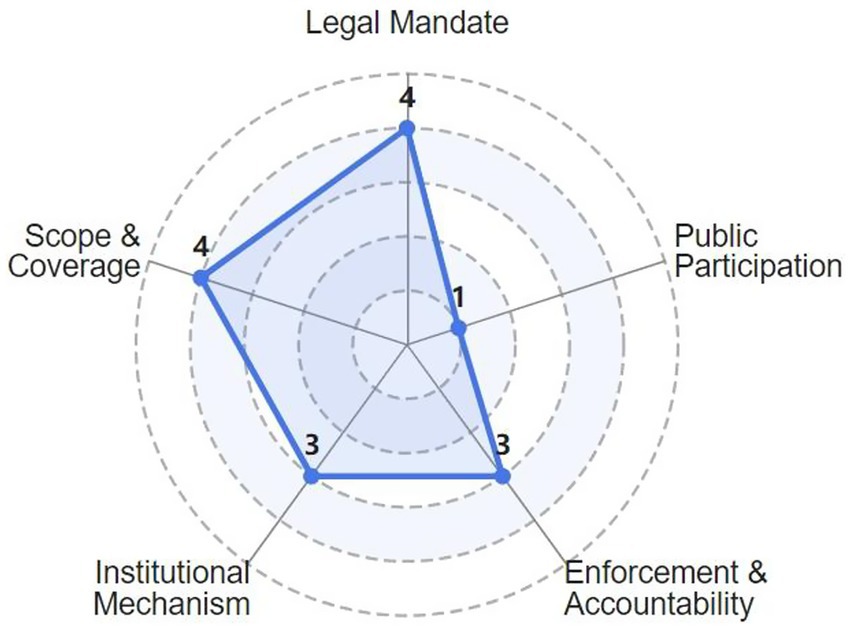 2. ^Scores (0–5) are based on textual analysis of constitutional, statutory, and policy documents (2016–2022). A score of 5 indicates full development of the institutional element; 0 indicates absence. Data sources: Normative instruments mentioned in Table 1. Public participation remains the weakest dimension, highlighting a critical gap in democratic accountability.