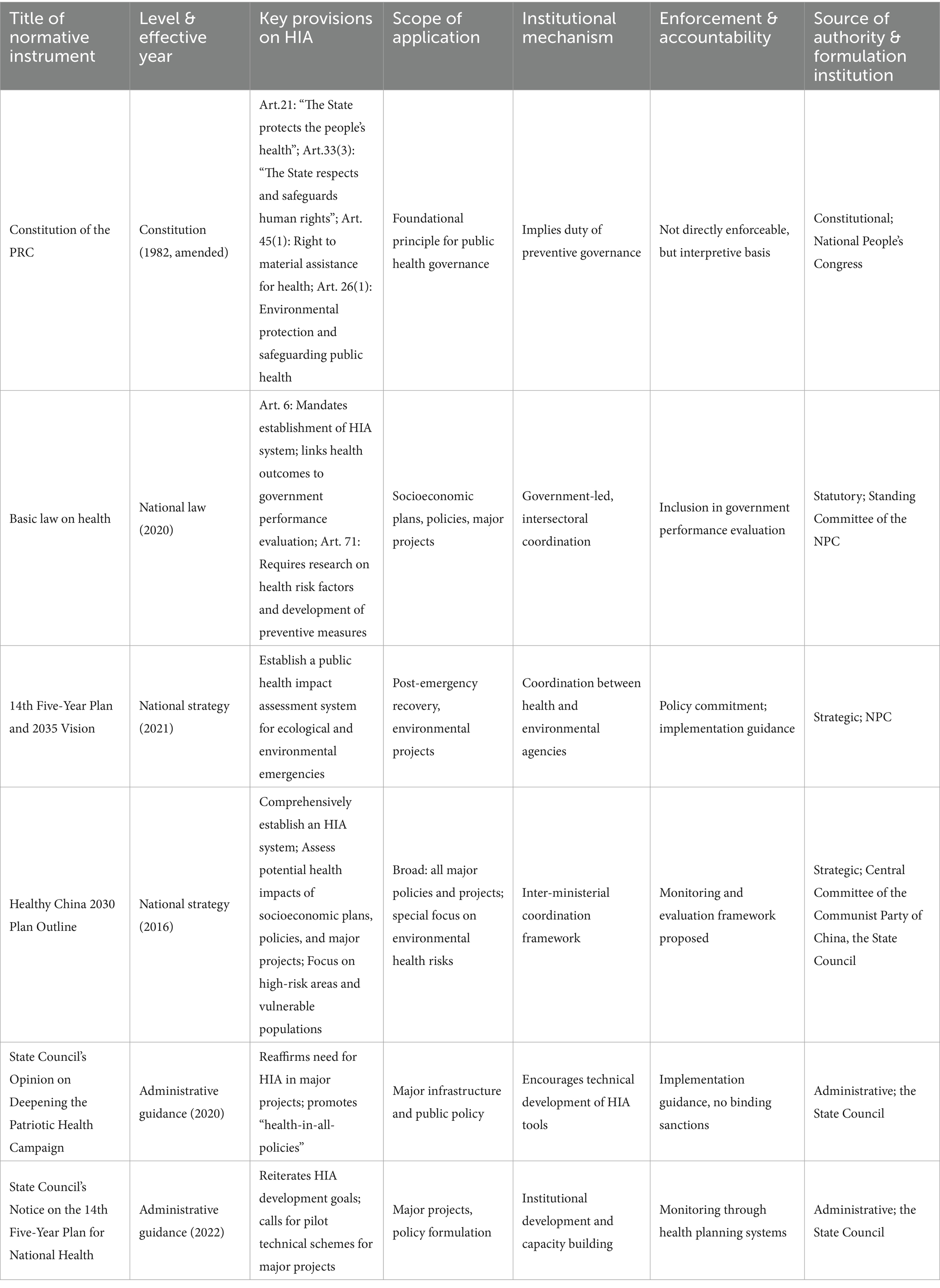 To map the evolving legal and policy landscape for HIA in China, Table 1 synthesizes key provisions across constitutional, statutory, and strategic instruments. This multi-level analysis reveals a growing normative commitment to institutionalizing HIA, though binding enforcement mechanisms remain limited outside the Basic Law on health.1