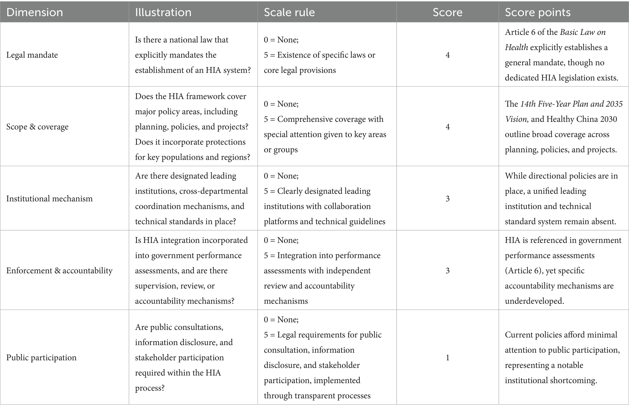 Based on the HIA framework established by the WHO and drawing on relevant experiences from countries with advanced HIA systems, such as the United States, the United Kingdom, Canada, Australia, Finland, and Thailand. This paper constructs an ideal HIA model (11). This model serves as a basis for evaluating the development of China’s HIA system across five key institutionalization dimensions, thereby illustrating its current status (12). Explanations of these evaluation dimensions and the rationale for scoring are provided in Table 2.2