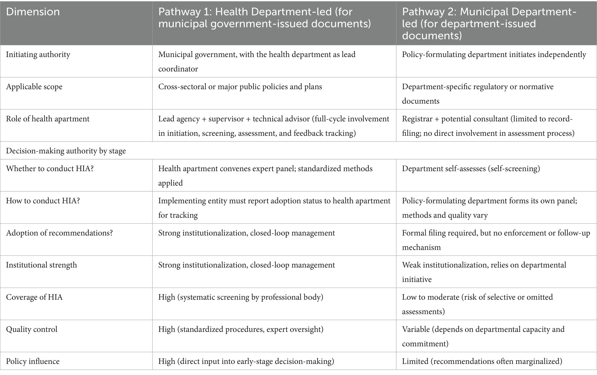 At present, pilot initiatives across various regions have generally reached a consensus that distinct assessment processes should be applied to documents issued by municipal governments and those produced by specific municipal government departments (18). This agreement arises from fundamental differences in institutional design and operational logic between the two types of documents, particularly in three key aspects: (1) the role of the health department in the evaluation process; (2) the allocation of decision-making authority at different stages; and (3) the extent of influence that decisions exert on final outcomes. This paper systematically examines and compares these two assessment models, highlighting the considerable tension within the HIA system between centralized coordination and departmental autonomy (Table 3).