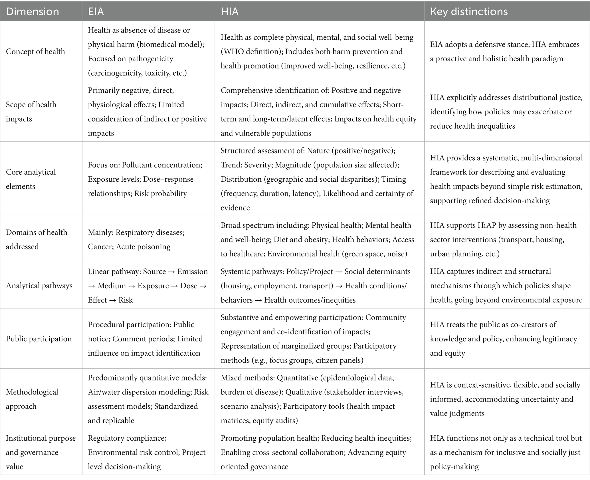 Indeed, the core strength of HIA does not lie merely in its ability to evaluate a broader set of health indicators than EIA, but rather in its reconceptualization of “health,” its distinct evaluative logic, and its transformative role in governance (30). These elements constitute the foundational basis for HIA’s institutional independence. To clarify these differences, the following Table 4 provides a comparative analysis of HIA and EIA.