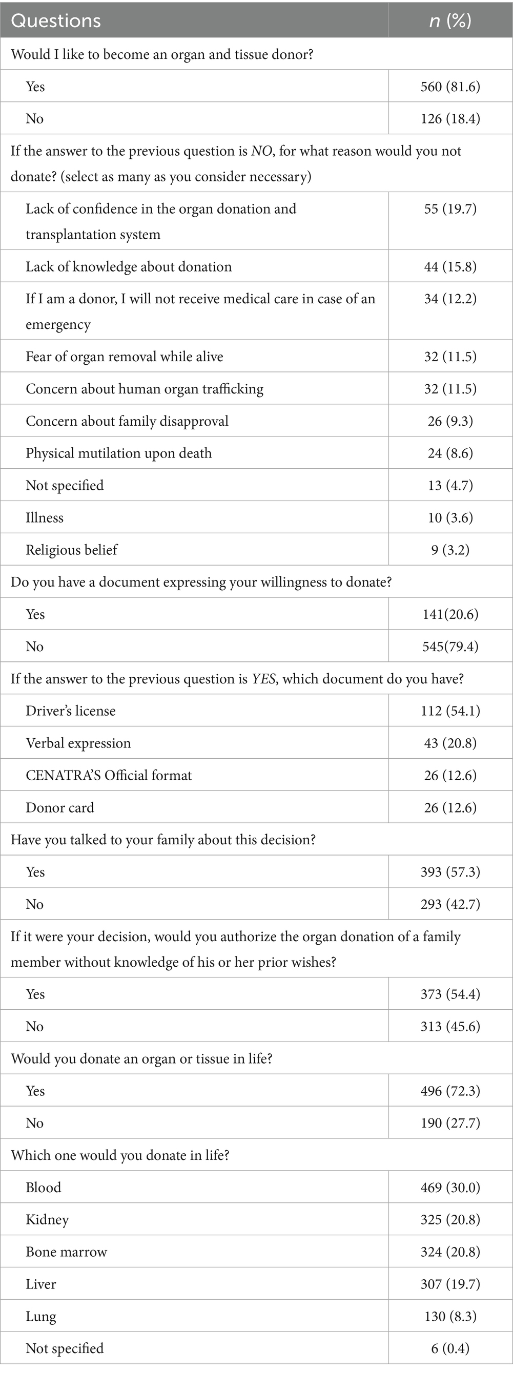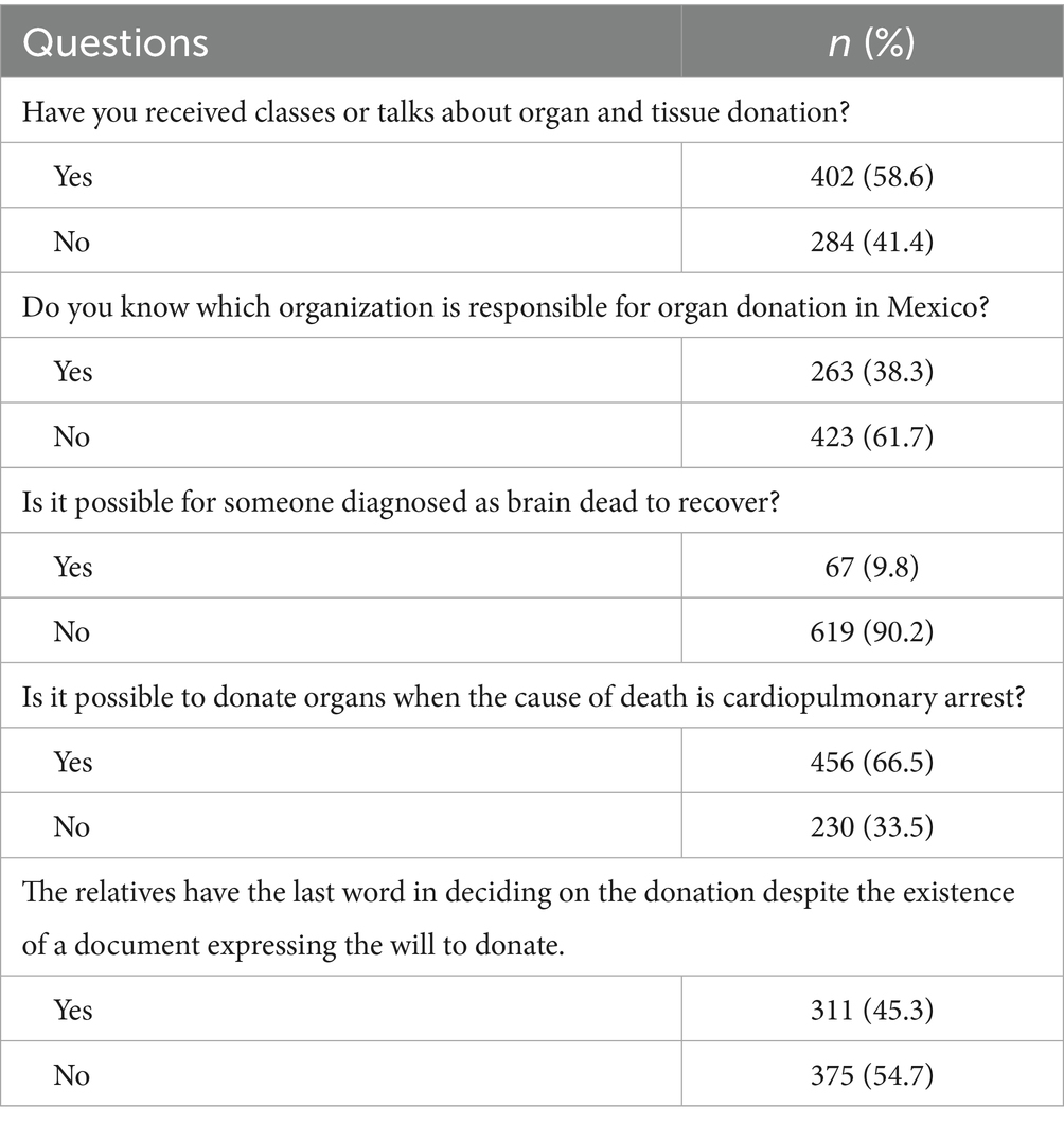 A total of 402 participants (58.6%) had received prior education about organ donation. Only 263 respondents (38.3%) correctly identified the National Transplant Center (CENATRA) as the organization responsible for organ donation in Mexico. Concerning the cause of death, 456 respondents (66.5%) considered organ donation feasible following cardiac arrest, whereas 619 (90.2%) recognized brain death as an irreversible condition. Additionally, 375 participants (54.7%) were unaware that the final decision regarding organ donation rests with the family, even when the potential donor had expressed their wishes even in a legal document (see Table 1).