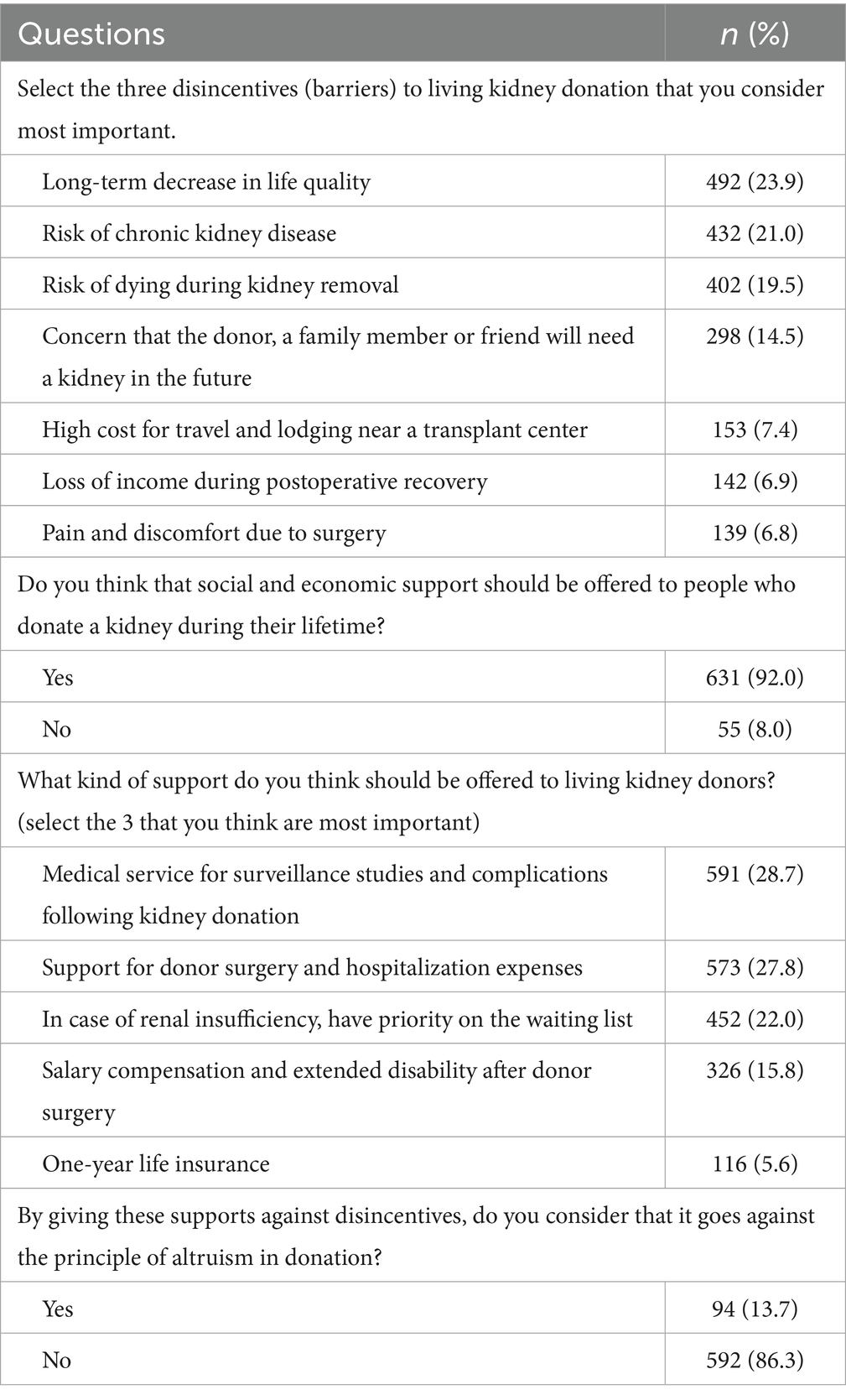 Based on multiple-response answers, the main disincentives and support strategies for living kidney donors are presented in Table 3. The three most frequent disincentives for living kidney donation are: a potential decline in long-term quality of life (n = 492; 23.9%), the risk of developing chronic kidney disease (n = 432; 21.0%), and fear of death during nephrectomy (n = 402; 19.5%). Furthermore, 631 participants (92.0%) expressed that living kidney donors should receive social or economic support, which they did not perceive as conflicting with the altruistic nature of organ donation. The most frequently preferred forms of support included access to medical services (n = 591; 28.7%), coverage of surgery and hospitalization expenses (n = 573; 27.8%), and priority placement on the transplant waiting list in cases of developing chronic kidney disease (n = 452; 22.0%).