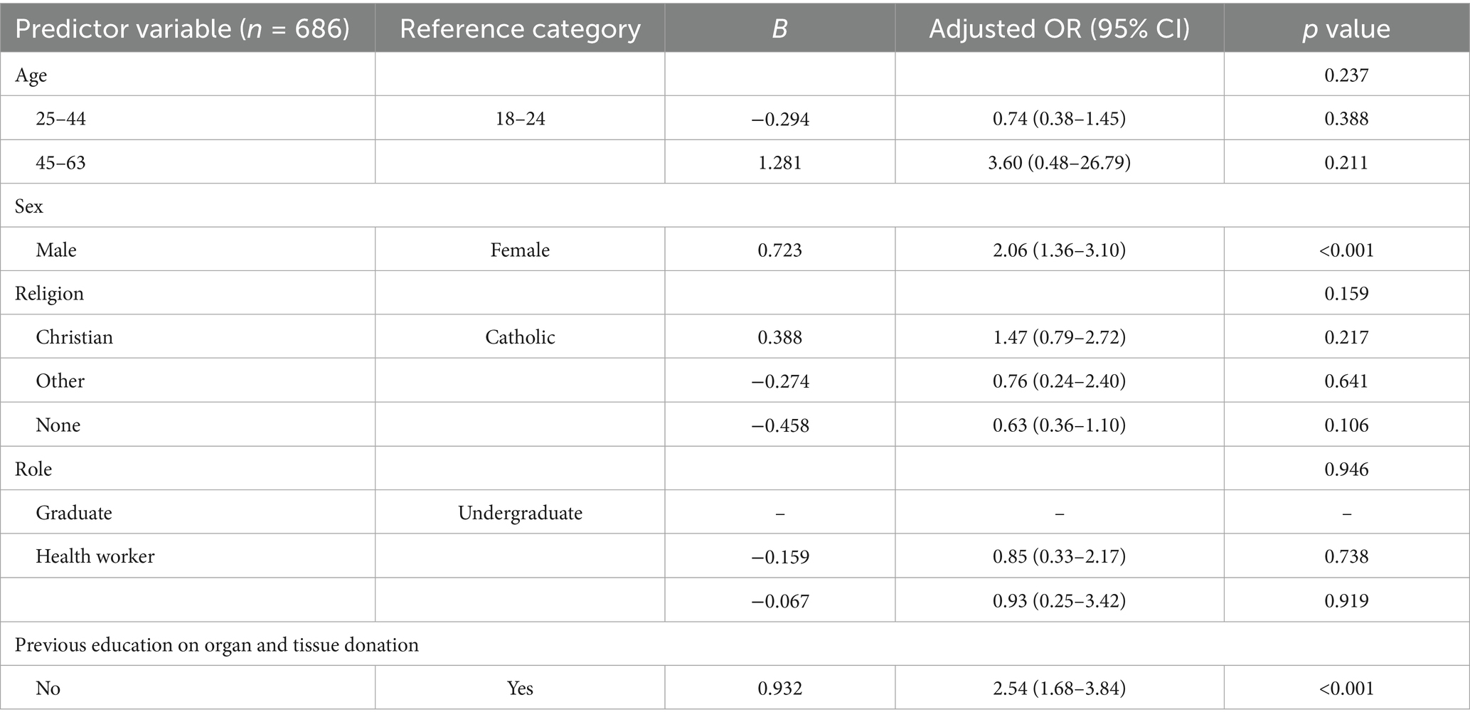 The logistic regression identified two key factors associated with the willingness to become a donor among current and future health professionals: female sex, consistent with previous evidence indicating stronger prosocial tendencies in the context of organ donation (33). Second, the transformative potential of formal education to shape positive attitudes toward donation. In contrast, age, religion and occupation were not significantly associated with willingness to donate. Given the homogeneous nature of the sample, the absence of significant associations may reflect the young adults who share similar biomedical and ethical education. This may reflect the population characteristics rather than a true absence of effect on.
