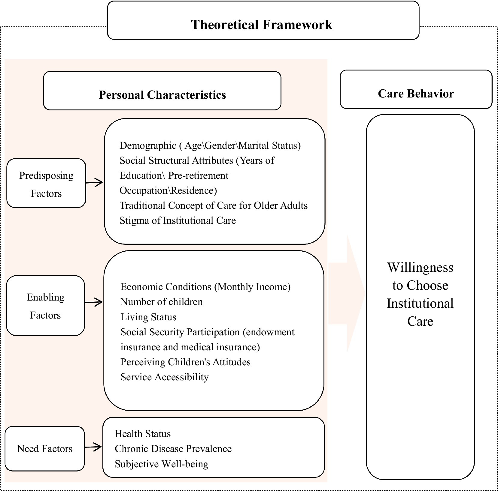 Therefore, under the framework of the existing Andersen’s Behavioral Model of Health Services Use, this study elaborates on how multiple factors systematically influence the older adults’ willingness toward institutional care. This model has been applied in several Chinese studies, as follows: Hongjuan Liu explored the older adults’ preferences for long-term care models—including home care, home- and community-based care, and institutional care—and their influencing factors based on the Andersen Behavioral Model, and conducted a classified comparison of the factors affecting these three care models (16). Wang et al. (17) focused on the actual utilization of institutional care among disabled older individuals and examined its influencing factors, currently, the utilization of institutional care by disabled older adults remains extremely low. Zhou et al. (18) applied the Andersen’s Model to test the factors influencing urban residents’ preference for home-based care. Yang et al. (19) emphasized the impact of multiple factors on the willingness toward institutional care among disabled older individuals. Compared with existing studies, this study has three distinct strengths: first, it focuses more explicitly on the willingness toward institutional care itself, rather than extending the scope to other care models for older adults or actual care utilization behaviors; second, its research participants include both urban and rural older adult groups as well as ordinary older individuals with varying health statuses, addressing the limitation of narrow sample representativeness in previous research; third, it integrates localized innovations into the classic theoretical framework. Specifically, within the Chinese cultural context, the study incorporates the influence of cultural values, thereby providing a novel and more explanatory analytical perspective for understanding the dilemma of care decision-making among Chinese older adults.