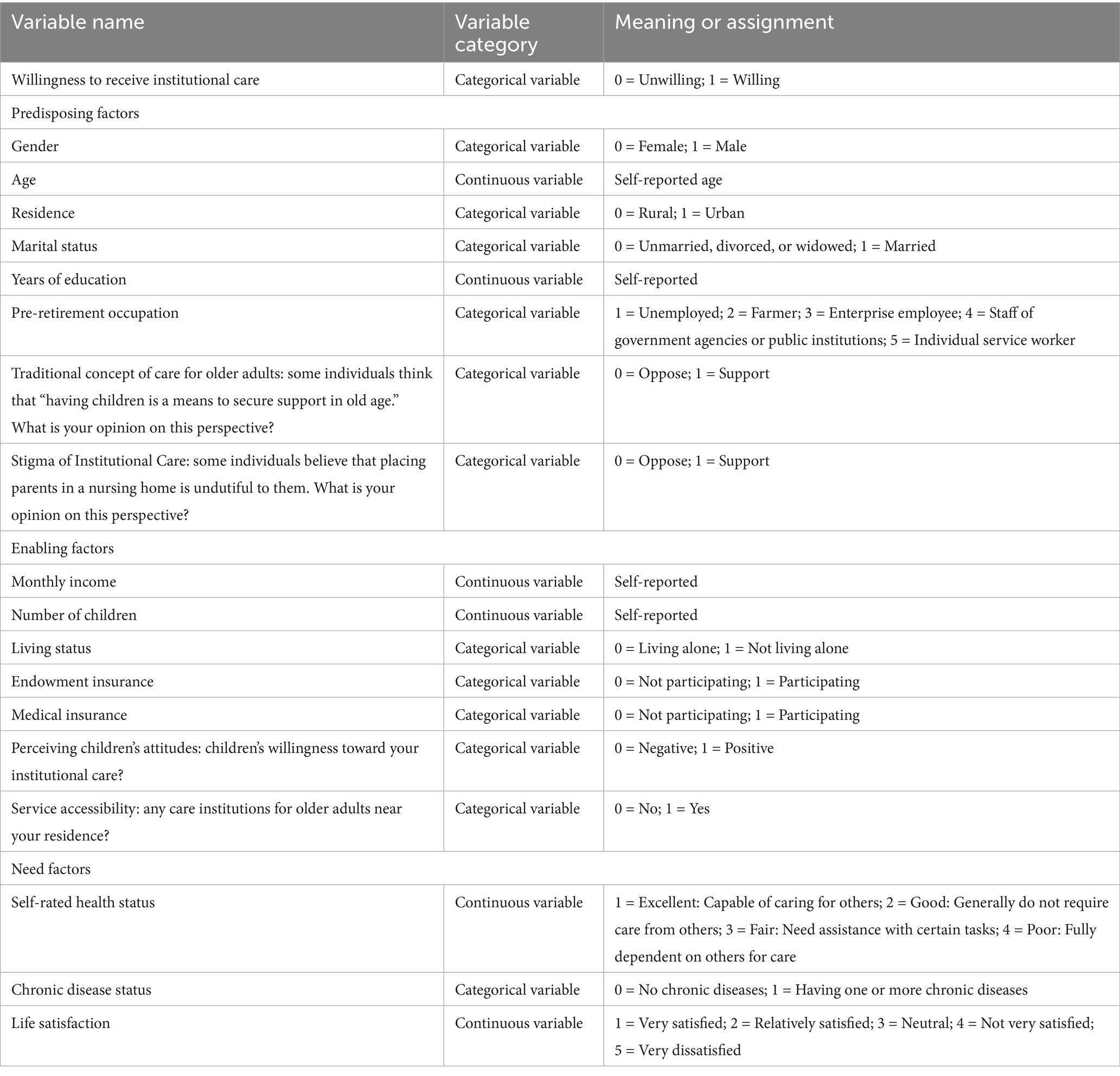 The influencing factors of the older adults’ willingness toward institutional care were categorized into three secondary indicators: Predisposing factors, enabling factors, and need factors, which were further refined into 18 tertiary indicators (see Table 1 for measurement details).