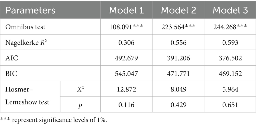 Collinearity diagnosis and goodness-of-fit test were conducted for the variables. To avoid collinearity among variables, a collinearity test was performed. The results showed that the Variance Inflation Factor (VIF) values of all variables were below 2 (ranging from 1.103 to 2.579), which were far lower than the critical value of 5 (22). This indicates that there was no multicollinearity in the model, and the regression results were robust. SPSS 25.0 was used to conduct goodness-of-fit tests on the model. It was found that the fitting effect improved progressively from Model 1 to Model 3. For the final model, the chi-square value was 244.268 with a significance p-value of 0.000, indicating statistical significance. The Nagelkerke R2 was 0.593 (>0.2), which suggests that the model had high explanatory power (23). For the Hosmer–Lemeshow Test, the chi-square value was 5.964 and p = 0.651 (>0.05), indicating a good model fit (24). Model fit coefficients are presented in Table 2.