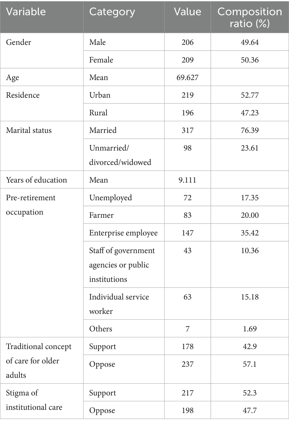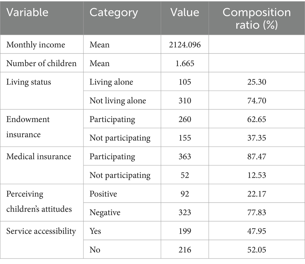 Table 3 presents the attributes of predisposing factors for the sample in this study. Among these attributes, the gender ratio was relatively balanced, with a slightly larger proportion of females than males: males accounted for 49.64%, and females for 50.36%. The average age was 69.627 years. A total of 76.39% of the older adults had a spouse. The average number of years of education was 9.11 years. Regarding pre-retirement occupations, enterprise employees constituted the largest group, with 147 individuals (accounting for 35.42% of the total sample). 42.9% of the older adults hold the traditional care concept of “having children is a means to secure support in old age,” whereas 52.3% of the older adults hold the perception of “stigma toward care institutions.”