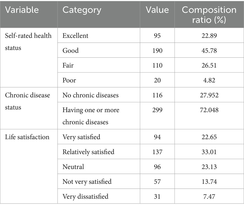 The specific distribution of need factors is presented in Table 5. Approximately 68.67% of the older adults (285 individuals in total) had full self-care ability, while around 26.51% (110 individuals in total) had partial self-care ability, and roughly 4.82% (20 individuals in total) had no self-care ability at all. Over 70% of the older adults suffered from one or more chronic diseases, and about 55.66% expressed satisfaction with their current living conditions.