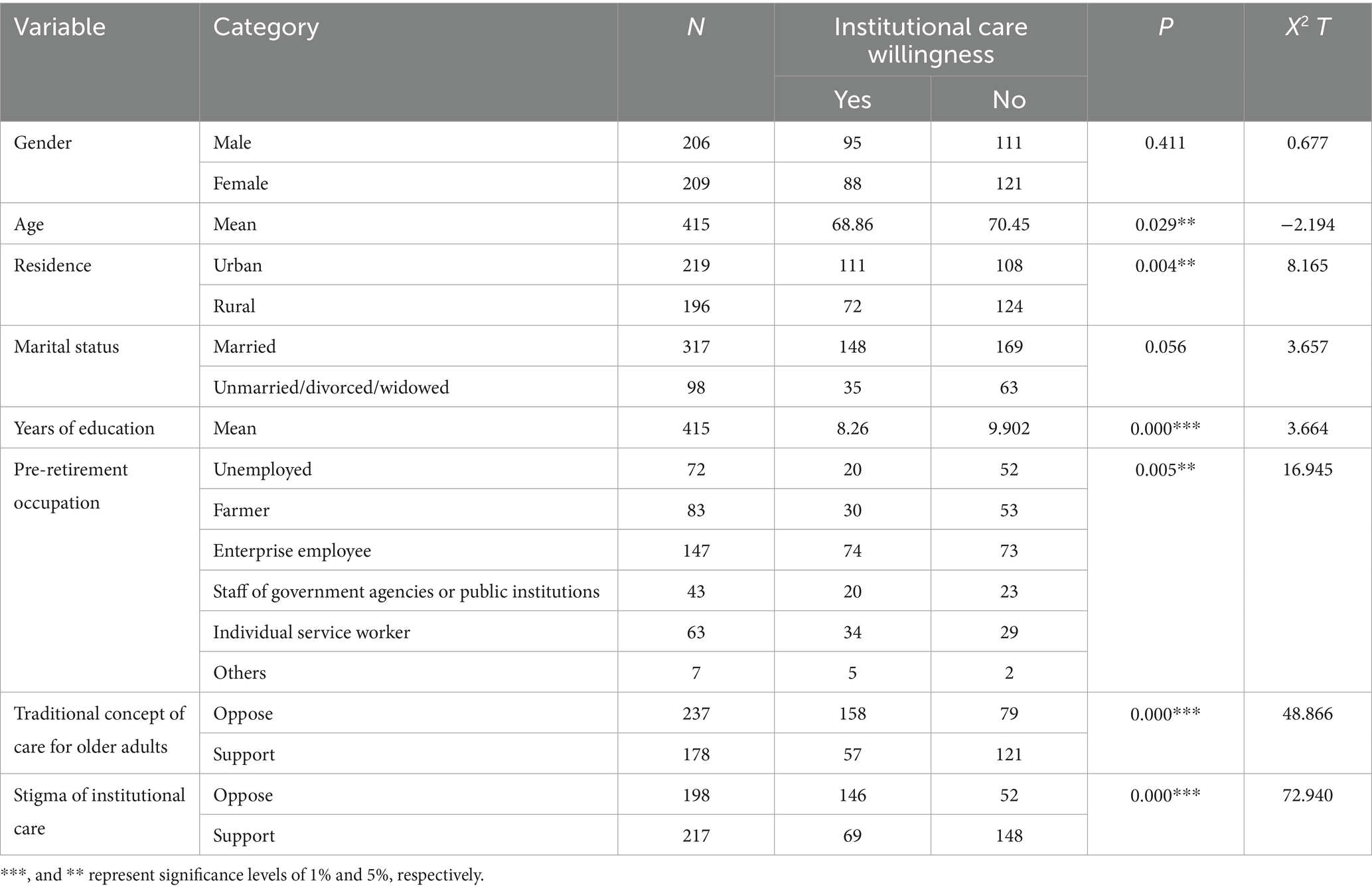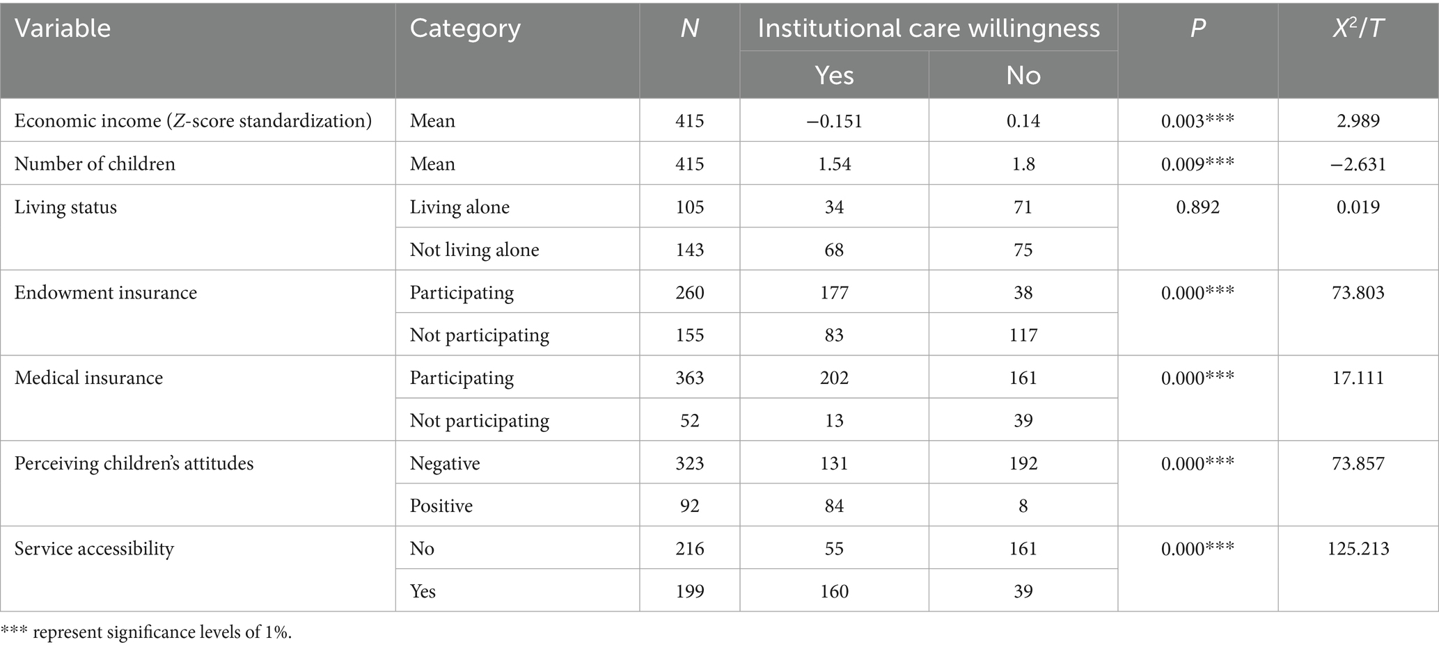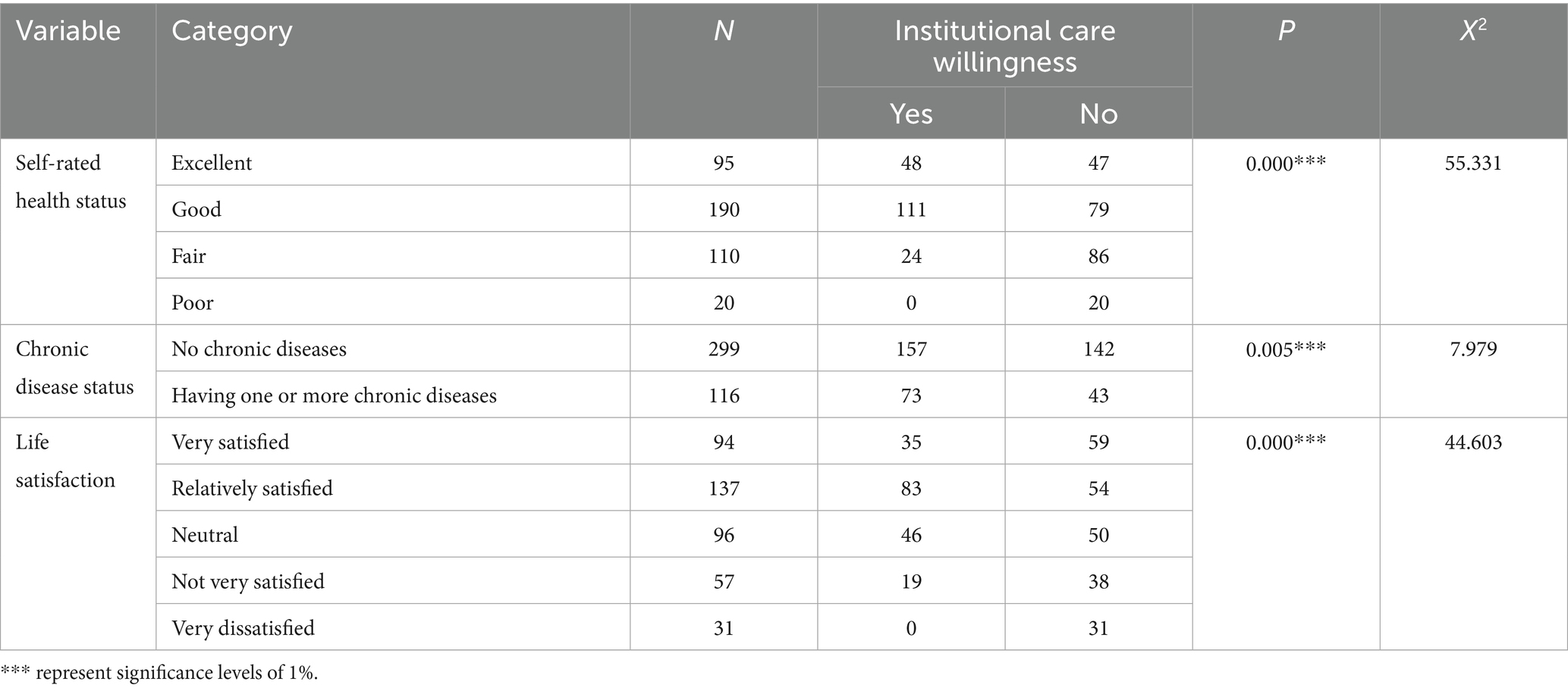 3.3 Univariate analysis of institutional care willingness