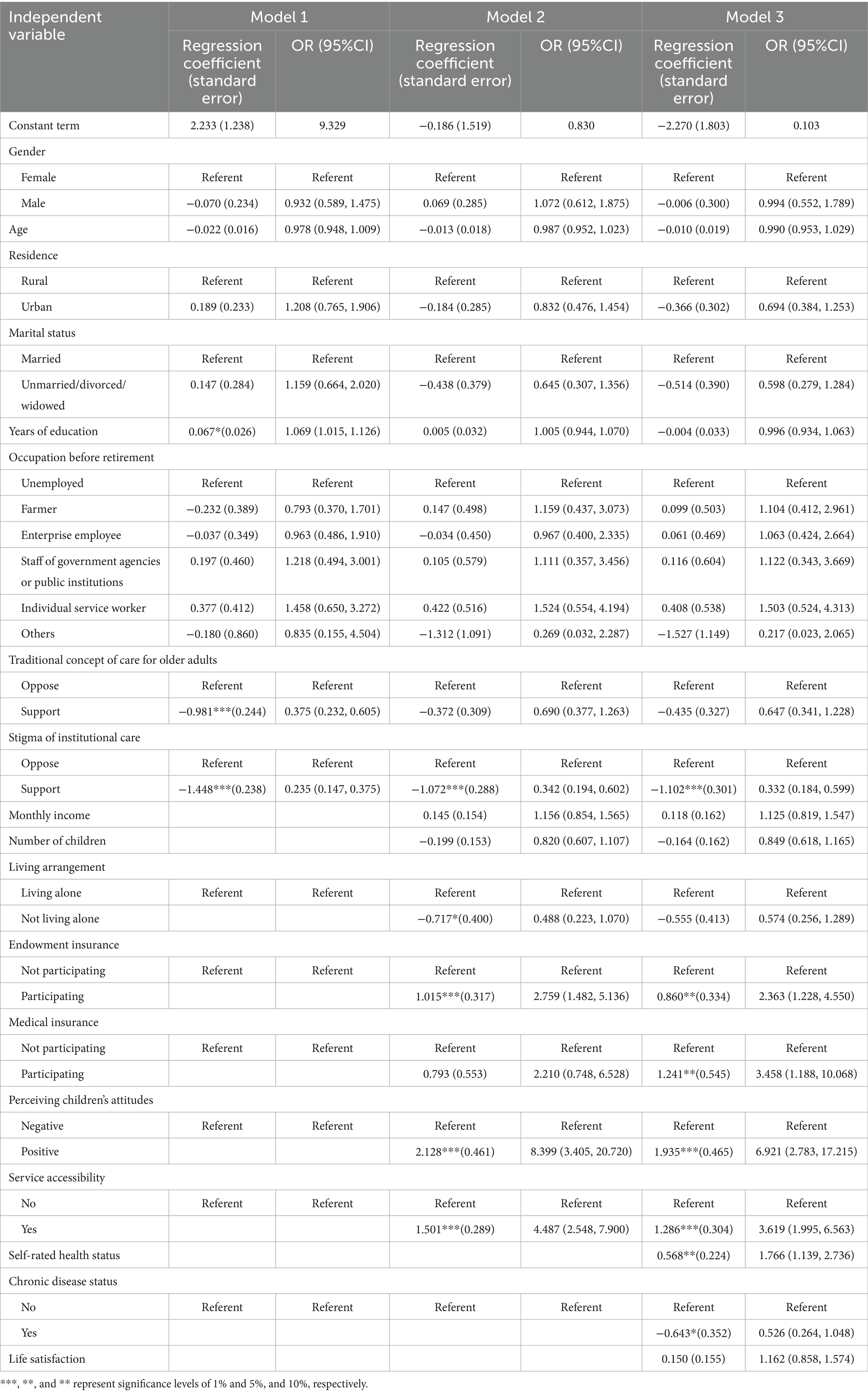 After in-depth analysis of the data, this study constructed three regression models to explore the correlation between different factors and the willingness for institutional care (see Table 9 for measurement details).
