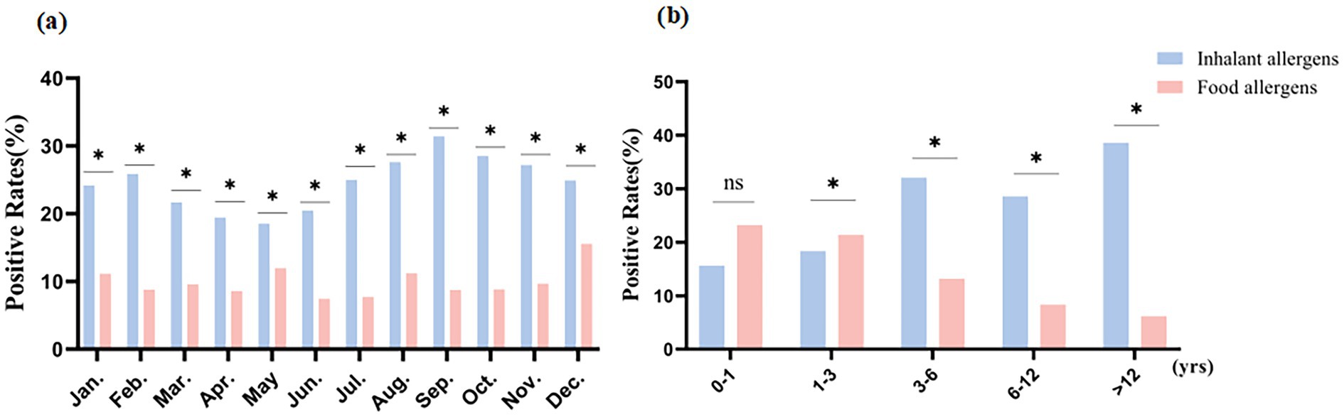 Figure 1. Distribution characteristics of inhalant and food allergens. * Original p-value < adjusted significance level (α′); ns: no statistical significance. (a) Distribution characteristics of inhalant and food allergens in different months; (b) Distribution characteristics of inhalant and food allergens in different age groups.