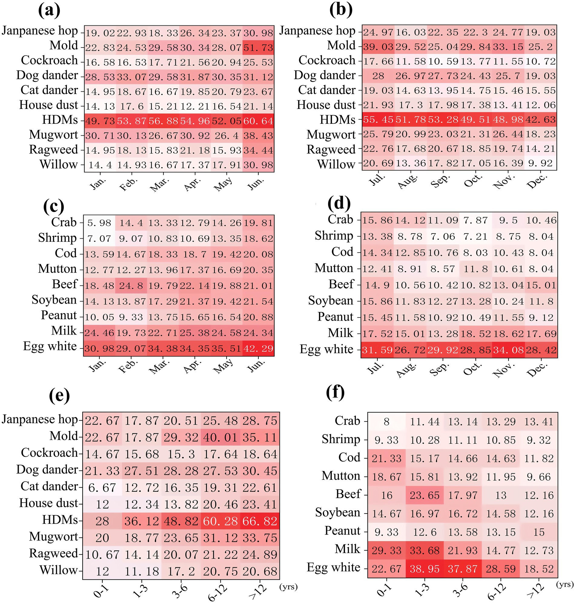 Figure 2. The heat maps of positive rates for inhalant and food allergens. (a) Positive rates of inhalant allergens distributed from January to June; (b) Positive rates of inhalant allergens distributed from July to December; (c) Positive rates of food allergens distributed from January to June; (d) Positive rates of food allergens distributed from July to December; (e) Positive rates of inhalant allergens distributed in different age groups; (f) Positive rates of food allergens distributed in different age groups.