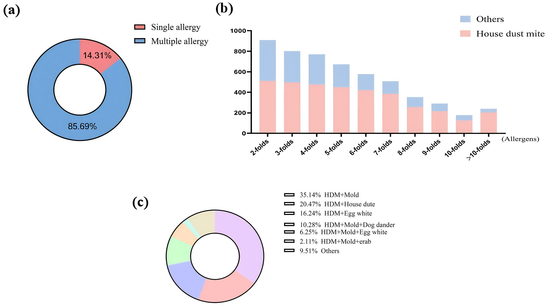 Figure 3. Distribution of allergens sensitization patterns. (a) Distribution of single sensitization and multiple sensitization; (b) Distribution of house dust mites in multiple sensitization; (c) Distribution of multiple sensitization patterns.