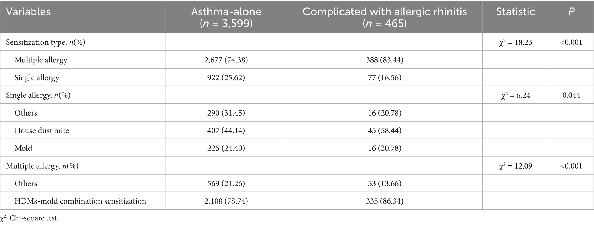 Table 3. Analysis of differences in allergen sensitization between the asthma-alone group and the asthma-complicated-with-allergic-rhinitis group.
