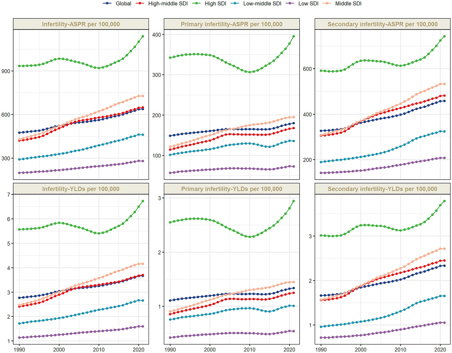 Six line graphs depict trends in infertility, primary infertility, and secondary infertility rates and YLDs per 100,000 from 1990 to 2020. The graphs show data categorized by Socio-Demographic Index (SDI) groups: low, low-middle, middle, high-middle, and high, along with global trends. Overall, the high SDI group has the highest values, showing an increasing trend, particularly in recent years. All SDI groups show some increase, with variations across categories and over time. The graphs include color-coded lines to differentiate the SDI groups.