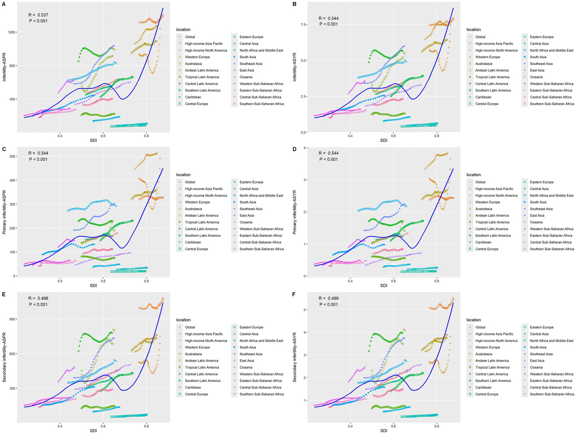 Six scatter plots, labeled A to F, display infertility rates (ASR and STR) across different regions versus the Socio-Demographic Index (SDI). Each plot includes a legend identifying regions by color. All plots show a positive correlation between infertility rates and SDI, indicated by R and P values. The regional trends vary, with global and specific regions like North Africa and the Middle East showing distinct patterns. Plots C and D focus on primary infertility, E and F on secondary infertility. All charts emphasize the relationship between higher SDI and increased infertility rates.