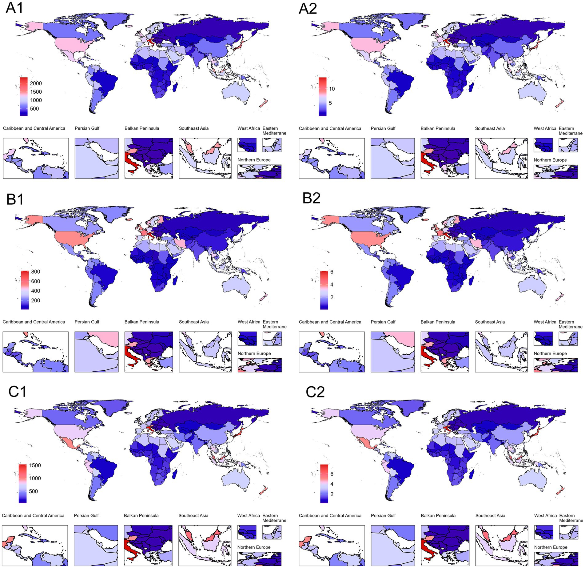 Six world maps labeled A1, A2, B1, B2, C1, and C2 show varying color gradients to represent data differences across regions like the Caribbean, Persian Gulf, and Southeast Asia. Each map is paired with smaller regional maps highlighting specific areas such as Northern Europe and the Balkan Peninsula. Legends indicate data intensity using color gradients from red to blue, varying per panel.