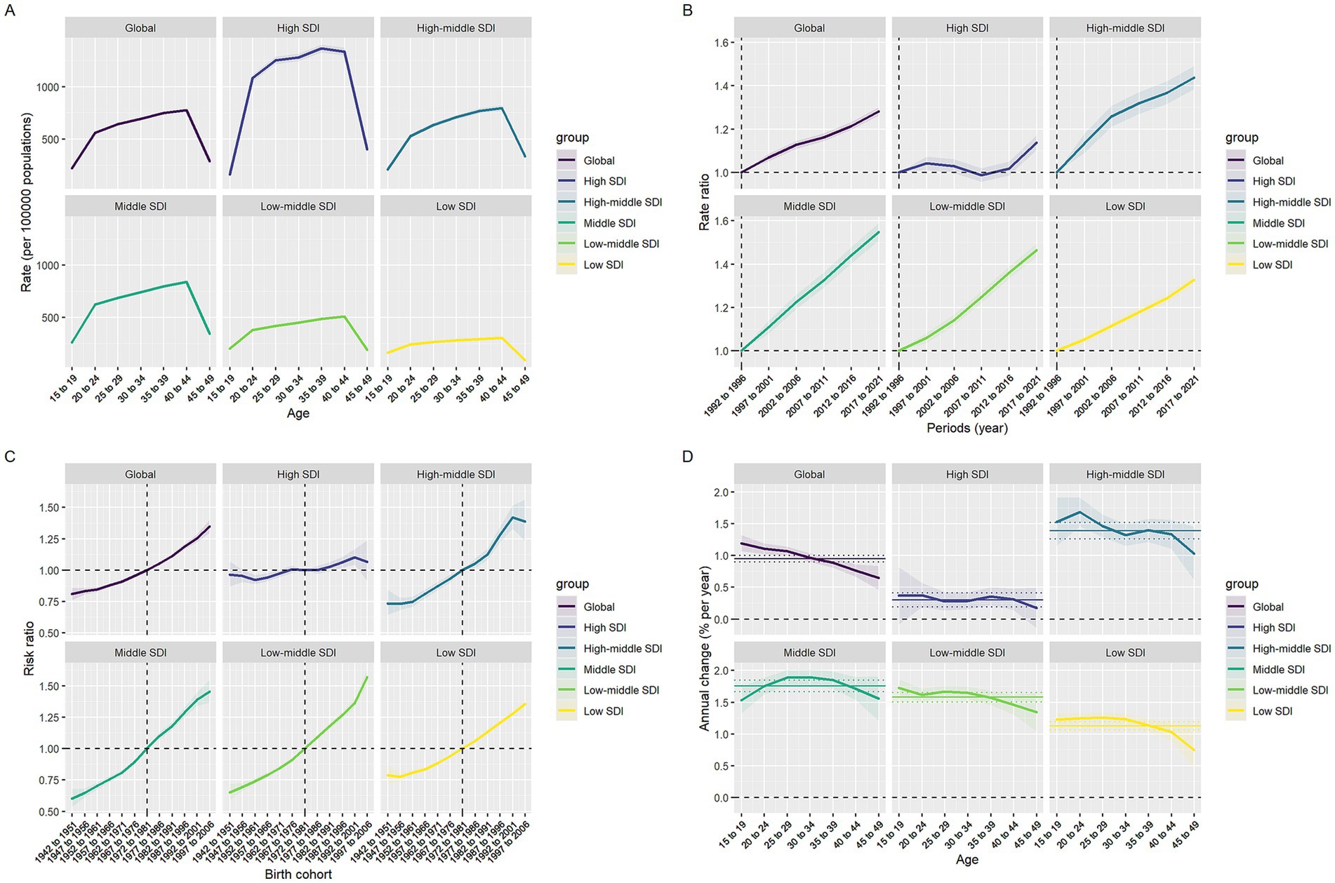 Four-panel chart displaying trends by age, period, and birth cohort for different sociodemographic index (SDI) groups. Panel A shows rate per 100,000 population by age. Panel B illustrates rate ratio by periods in years. Panel C presents risk ratio by birth cohort. Panel D depicts annual change percentage by age. Each panel includes data for global, high, high-middle, middle, low-middle, and low SDI groups, differentiated by color. The x-axes vary with age, period, and cohort, while y-axes show respective metrics like rate, ratio, or percentage.