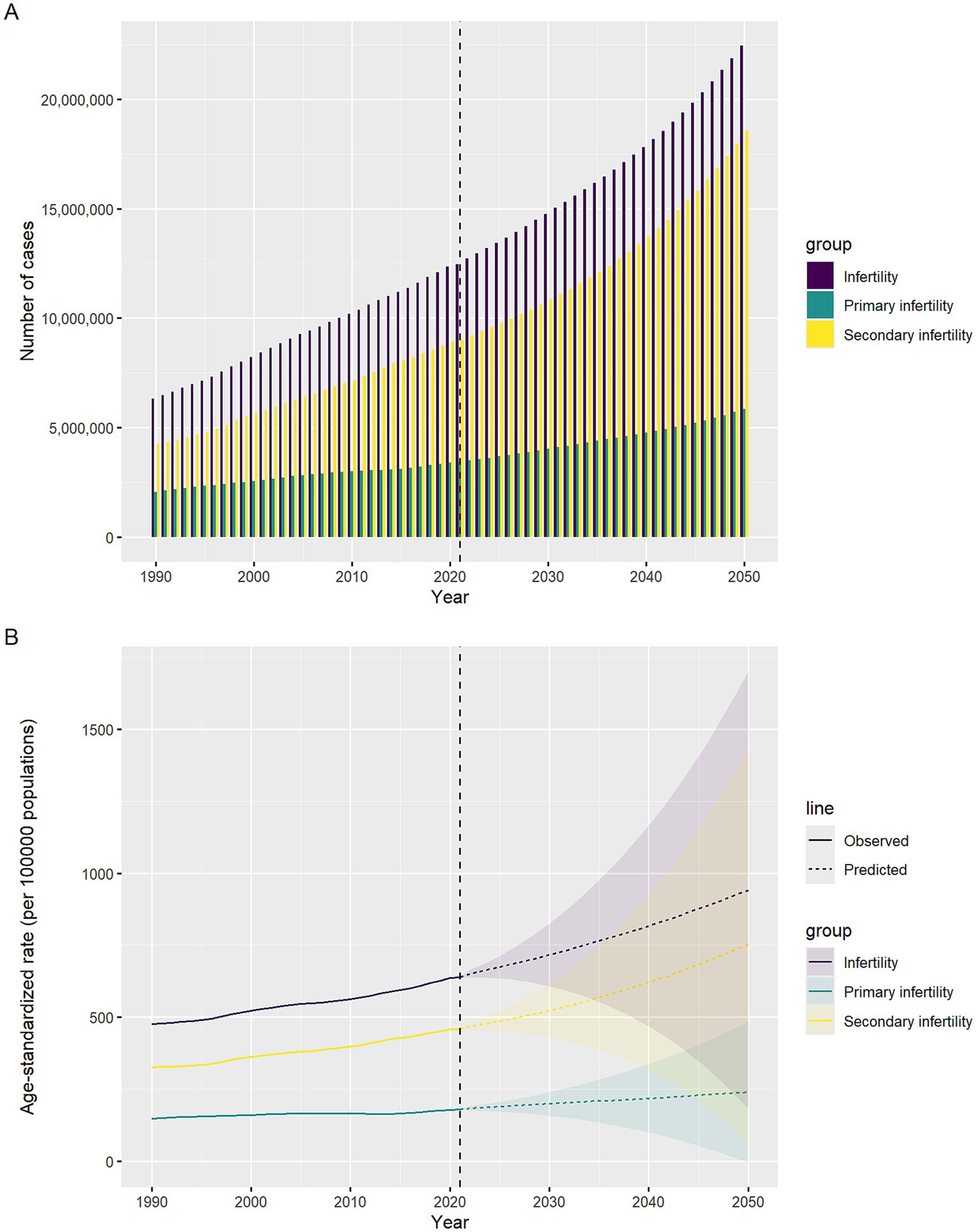 Graph A shows the number of infertility cases from 1990 to 2050, categorized into infertility, primary infertility, and secondary infertility. The number of cases is projected to increase, with a notable rise after 2020. Graph B illustrates the age-standardized rate per 100,000 populations for the same categories and years, indicating an upward trend with observed and predicted data. Both graphs highlight a significant increase over time, with varying growth rates for each category.