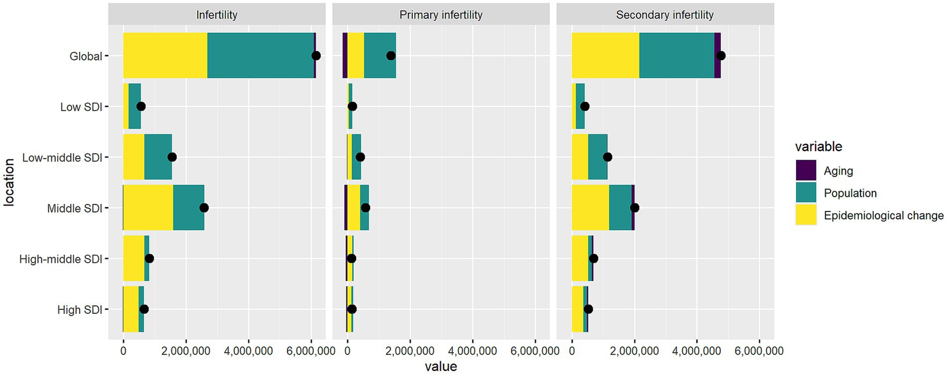 Bar charts showing infertility rates categorized by location: Global, Low SDI, Low-middle SDI, Middle SDI, High-middle SDI, and High SDI. Each chart distinguishes between Infertility, Primary Infertility, and Secondary Infertility. Colors represent aging, population, and epidemiological change.