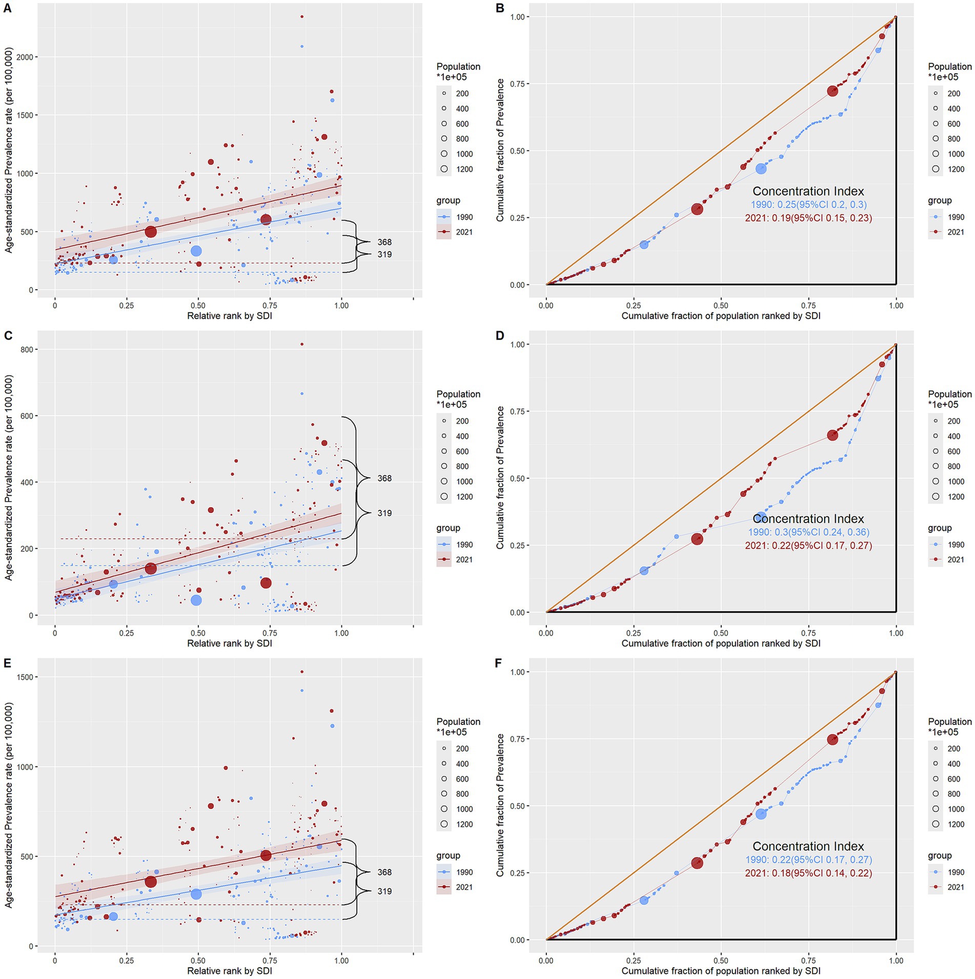 Six scatter plots and concentration curves comparing age-standardized prevalence rates per 100,000 against the relative rank by the Socio-Demographic Index (SDI) for 1990 and 2021. Plots A, C, and E show upward trends with data points sized by population, with red representing 1990 and blue representing 2021. Plots B, D, and F feature Lorenz curves with concentration index values for each year, indicating inequality. Chart data is densely plotted, emphasizing the relationship between SDI and prevalence rates.