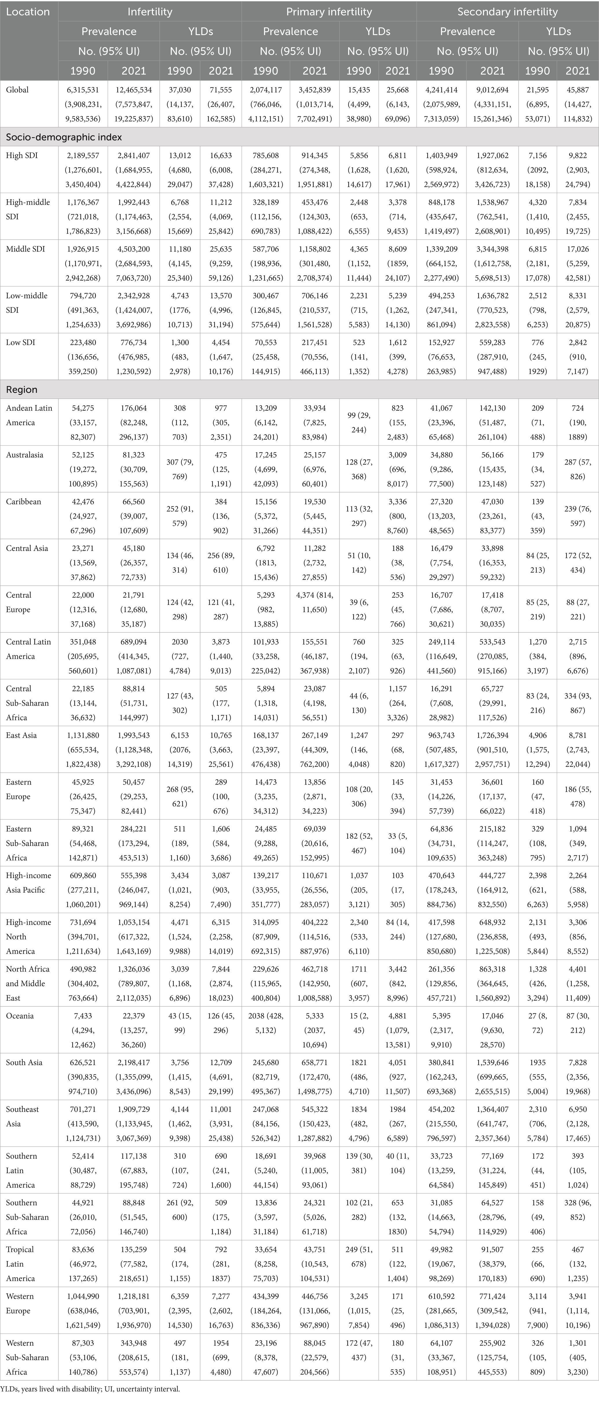 Table 1. The prevalence and YLDs of infertility (primary infertility and secondary infertility) due to PCOS at the global and regional levels in 1990 and 2021.