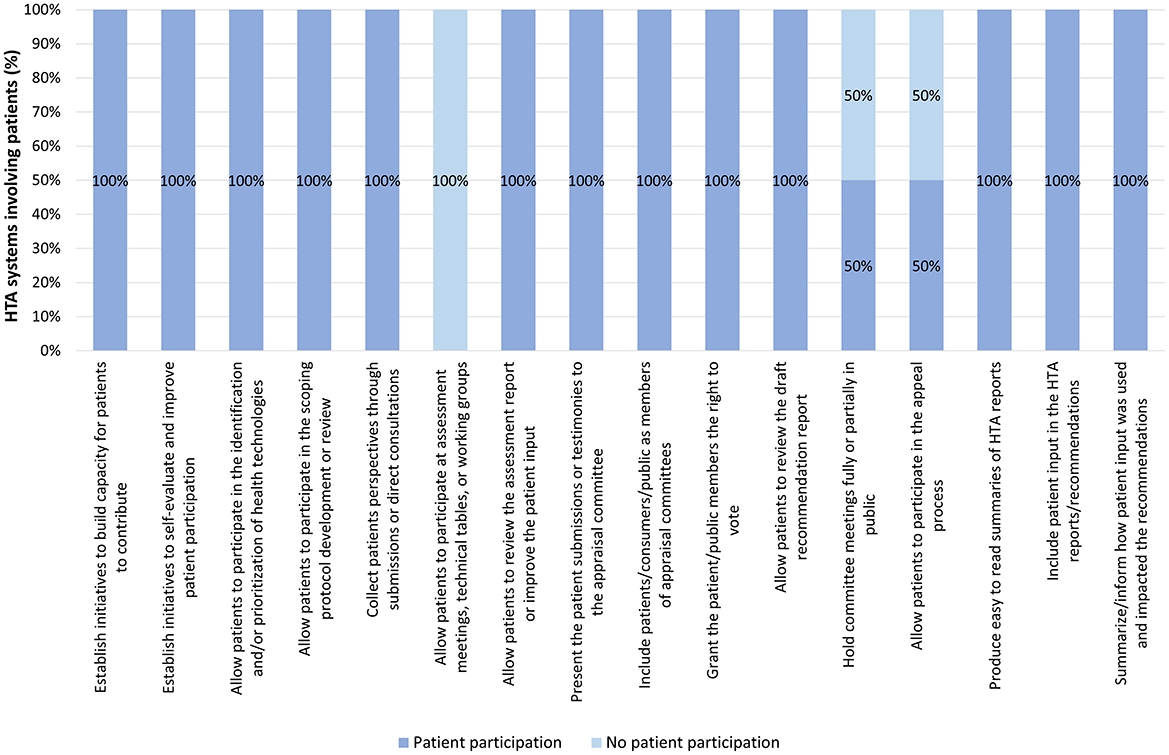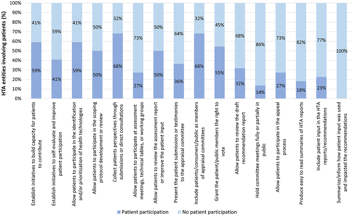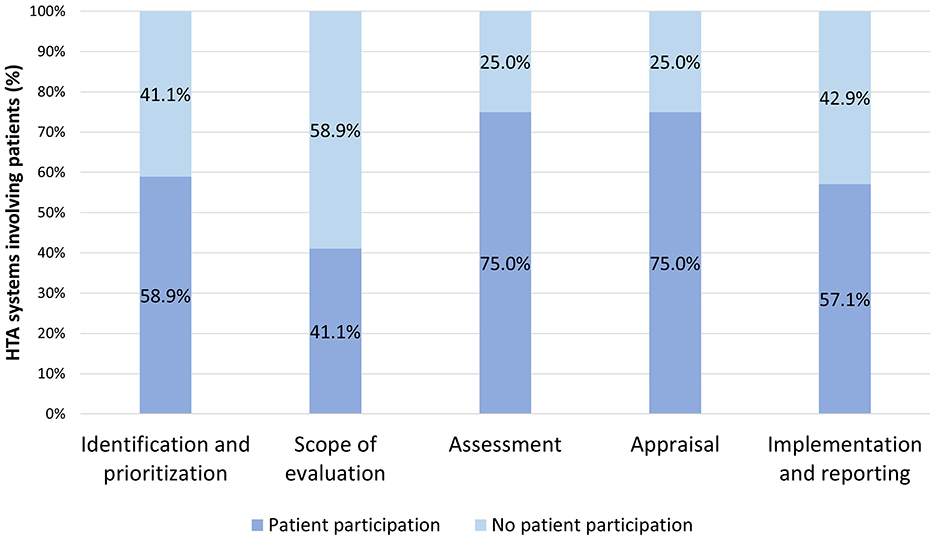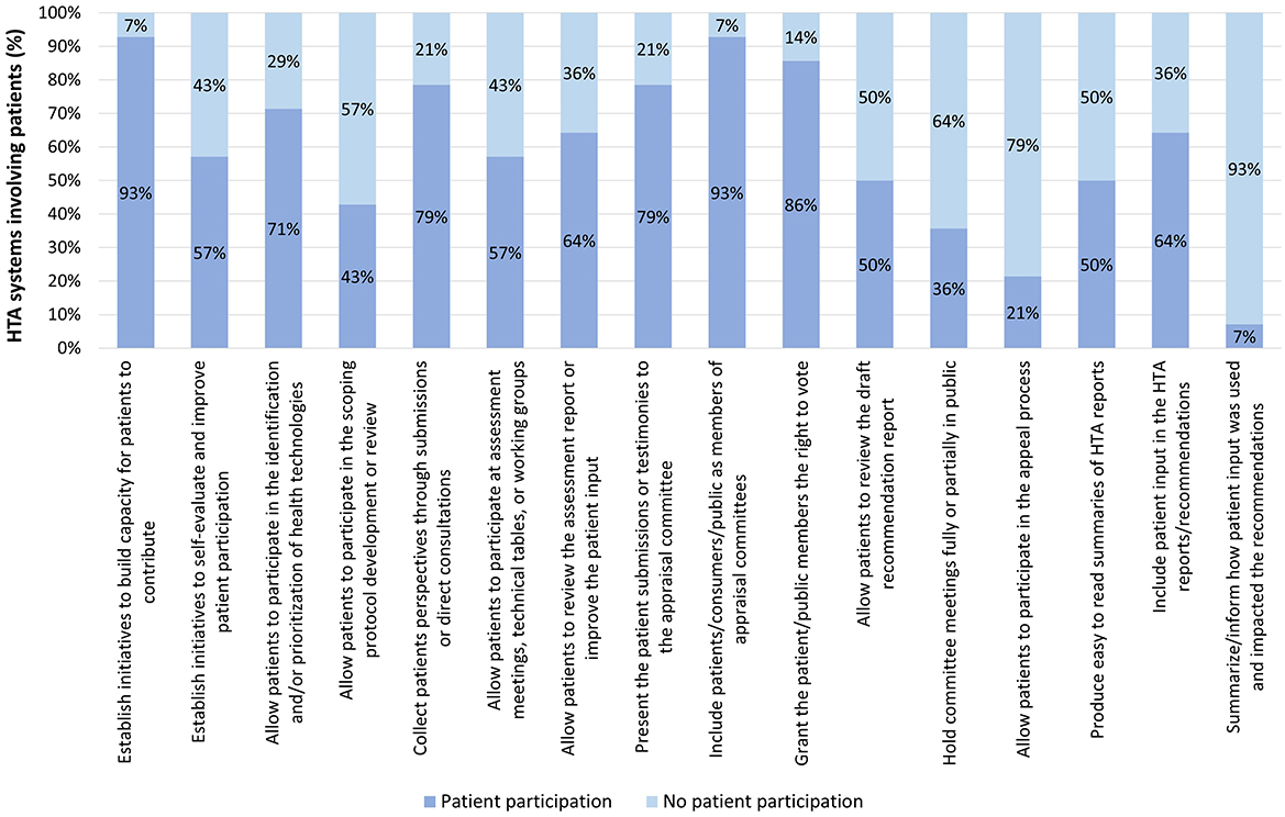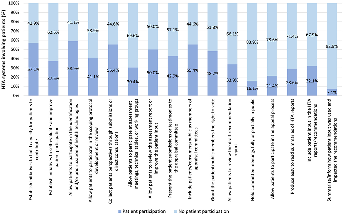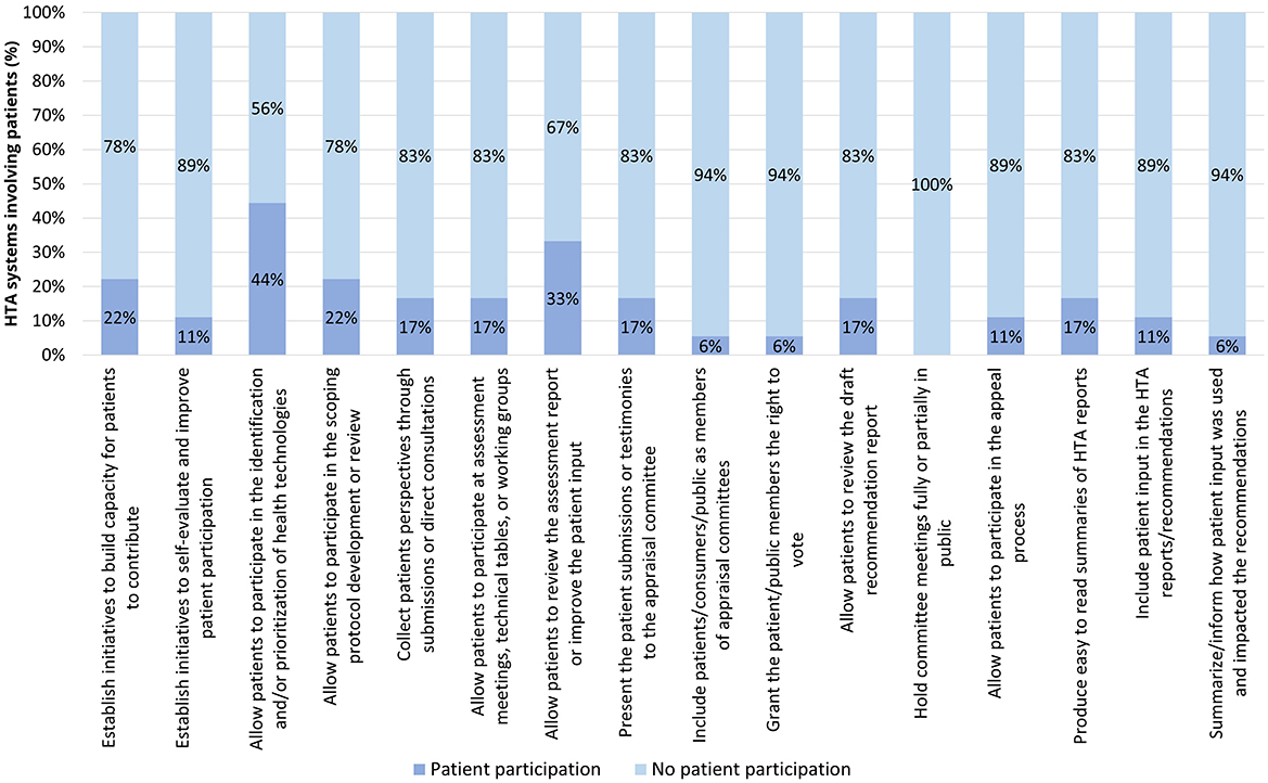 Discussion: To our knowledge, this is the first attempt to quantify patient participation on a wider scale to enable comparisons across a large sample of HTA systems. The findings offer policymakers, healthcare professionals, patients, and researchers a comprehensive view of current approaches and highlight opportunities to enhance patient involvement in HTA.