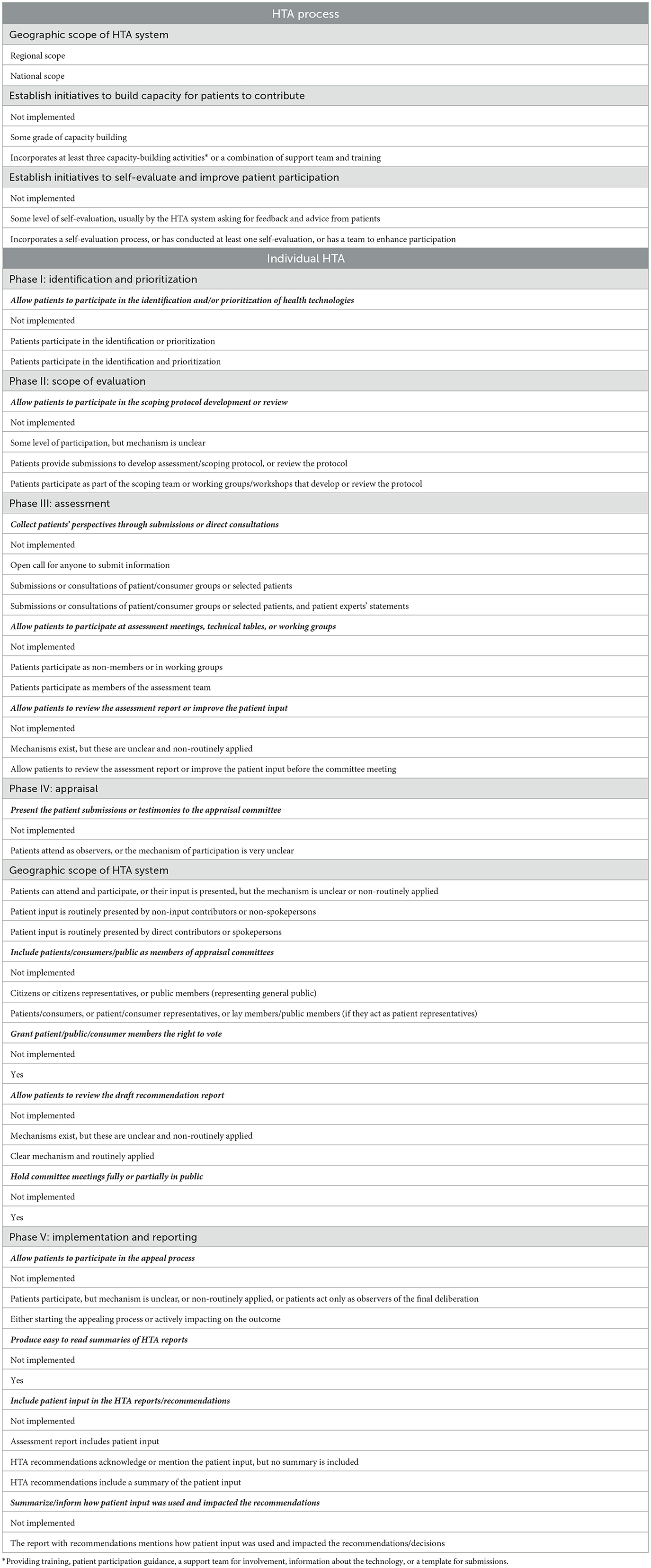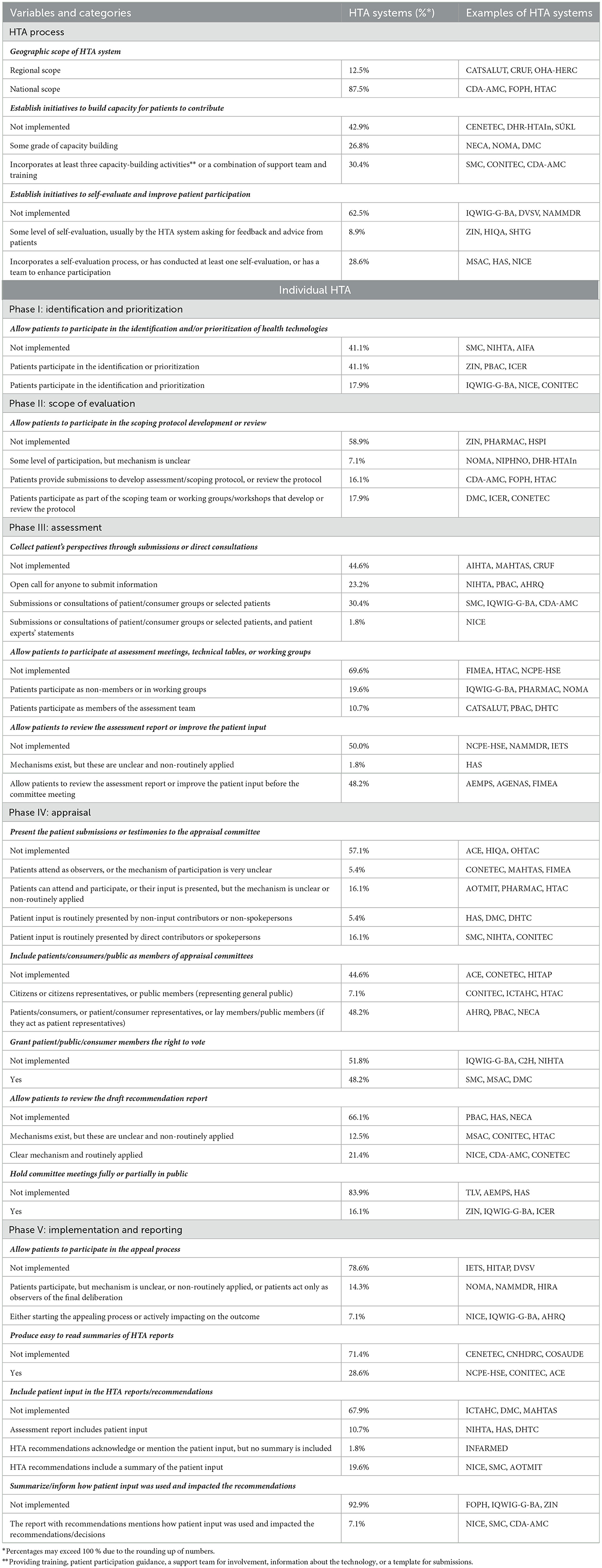 Prior to identifying or evaluating any HTA systems, the scope of HTA and the set of activities in which patient participation was deemed to be important were established. The list was based on published literature (4, 10, 17–19, 21, 27–30) and was designed to capture a comprehensive yet manageable set of recognized practices, spanning all HTA phases and balancing structural mechanisms (e.g., voting rights, committee membership), procedural practices (e.g., consultations, submissions, report reviews), and transparency measures (e.g., lay summaries, feedback on input use). The phases of HTA that were considered in scope for the purposes of this study were identification and prioritization of health technologies, scoping of evaluation, assessment, appraisal, and implementation and reporting, which parallel those defined by Goodman (31). Within each HTA phase, relevant activities were defined as variables, and a set of categories were developed for each variable to measure the level of patient participation. Additionally, a few variables were independent of these phases and applied to the overall HTA process. Table 1 presents the 17 variables and their main categories used to assess patient participation in the study. Three of the 17 variables were not classified within the phases due to their application to the general HTA process. A more detailed breakdown of the categories and variables can be found in Supplementary Table 1.