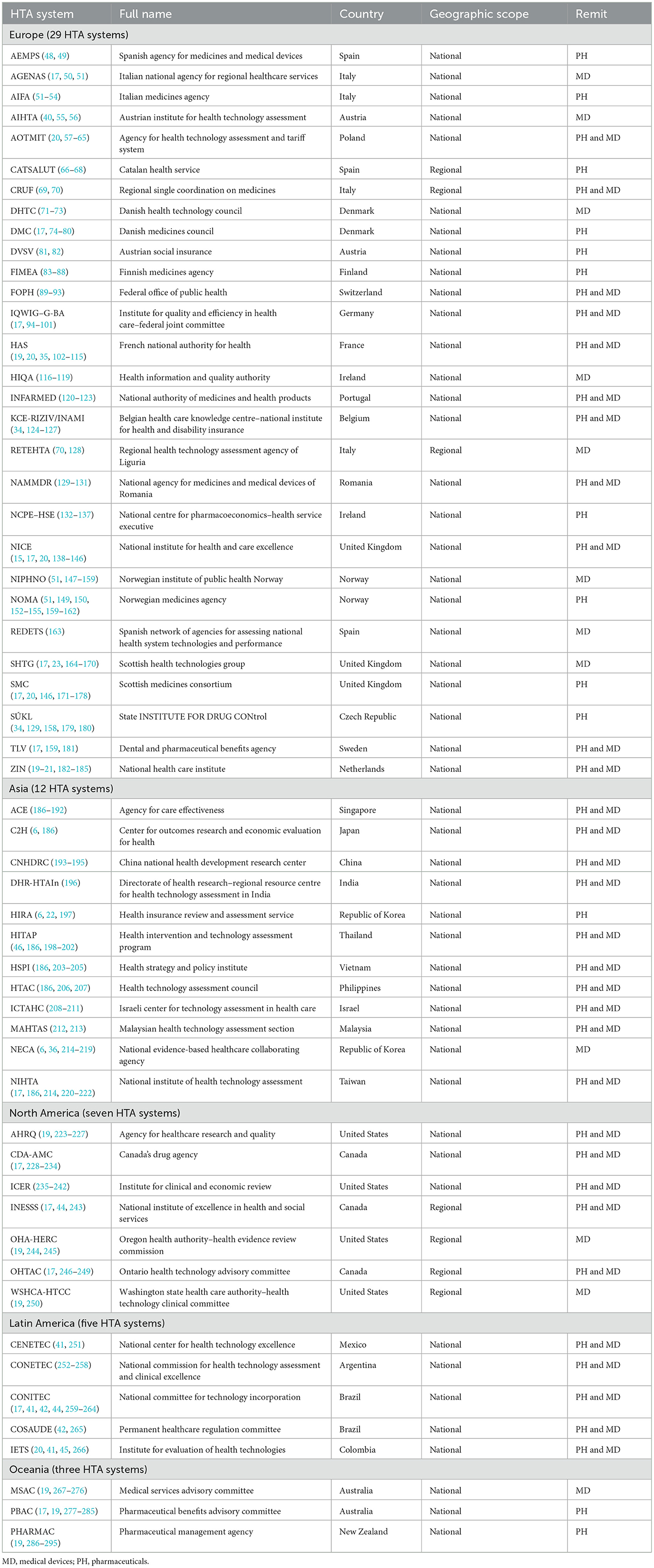 Table 2. Distribution per region, geographic scope and remit of the final list of analyzed HTA systems.