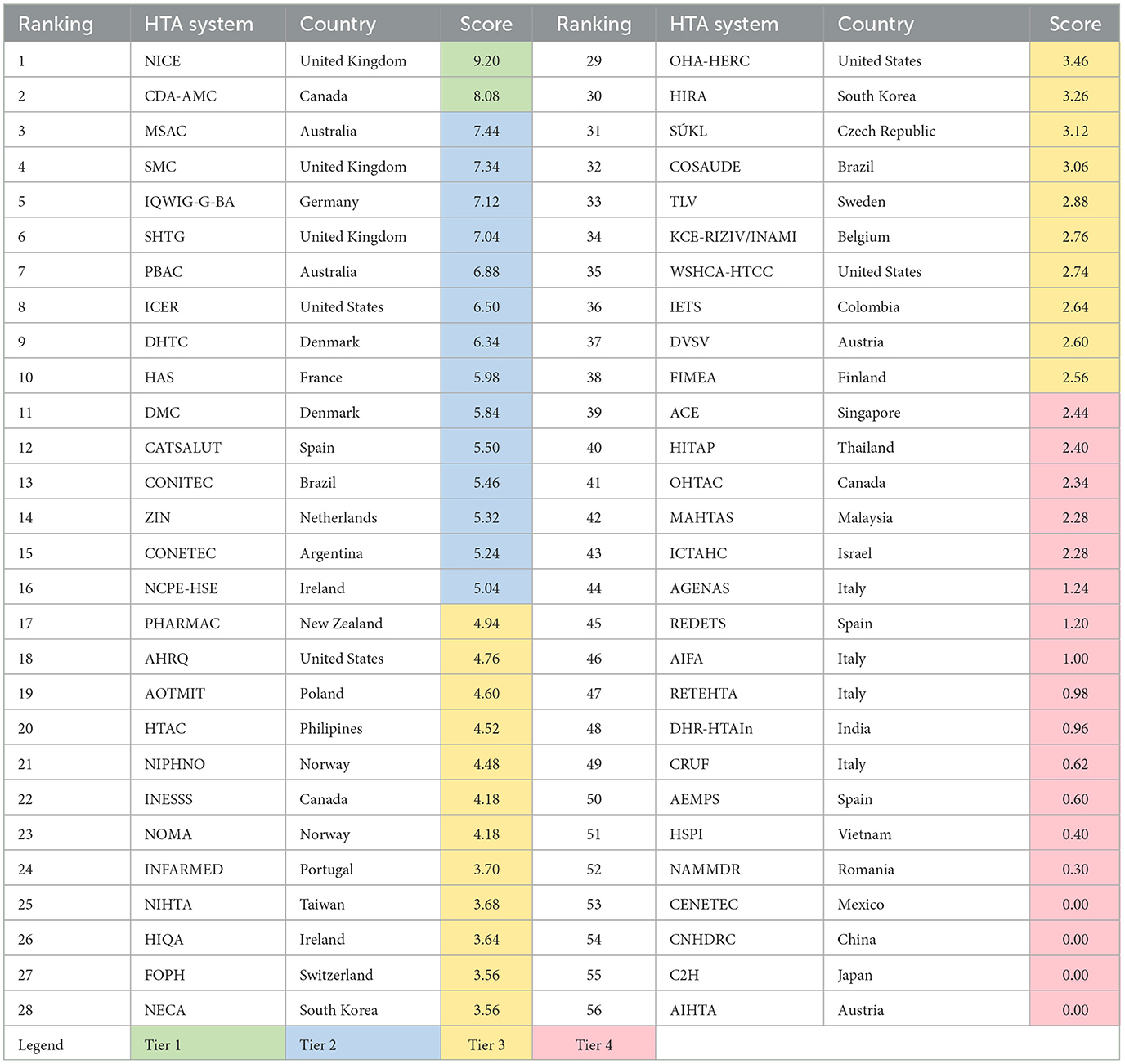 In Europe, the larger number of systems assessed might explain the even distribution across tiers, coming in 3rd place in terms of average score. Notably, NICE and SMC, secured the 1st and 4th rankings, respectively, showcasing exemplary systems. NICE is globally recognized for the comprehensive involvement of the public and patient community throughout the entire HTA process. It incorporates diverse perspectives, offers extensive support through its Patient Participation Program, and actively seeks feedback and implements self-evaluation strategies to continuously improve patient participation. Similarly, SMC actively encourages patient contribution, facilitating participation through a dedicated Public Participation Team, submission templates, and a user-friendly website. Improvements have been seen in certain HTA systems, such as HAS (ranked 10th), DHTC and DMC (ranked 9th and 11th), or KCE-INAMI/RIZIV in Belgium (ranked 33rd). HAS, for example, began involving the patient community in 2016, developing an online contribution process, including patient representatives as voting members in appraisal committees, and publicly disclosing a comprehensive self-evaluation of their user/citizen participation methods. In contrast, AIHTA in Austria, despite having expressed intentions to involve patients, it showed limited evidence of patient participation (40). Importantly, HTA in Europe is undergoing significant changes toward more unified market access, particularly through the introduction of the Joint Clinical Assessment (JCA). JCA will centralize the clinical evidence assessment phase at the European level, and consequently, patient involvement in this phase will be coordinated at the European level. However, since the appraisal phase will remain the responsibility of individual countries, patient involvement in this phase will vary depending on national policies. This evolving framework highlights the importance of updating our study to align with these changes.