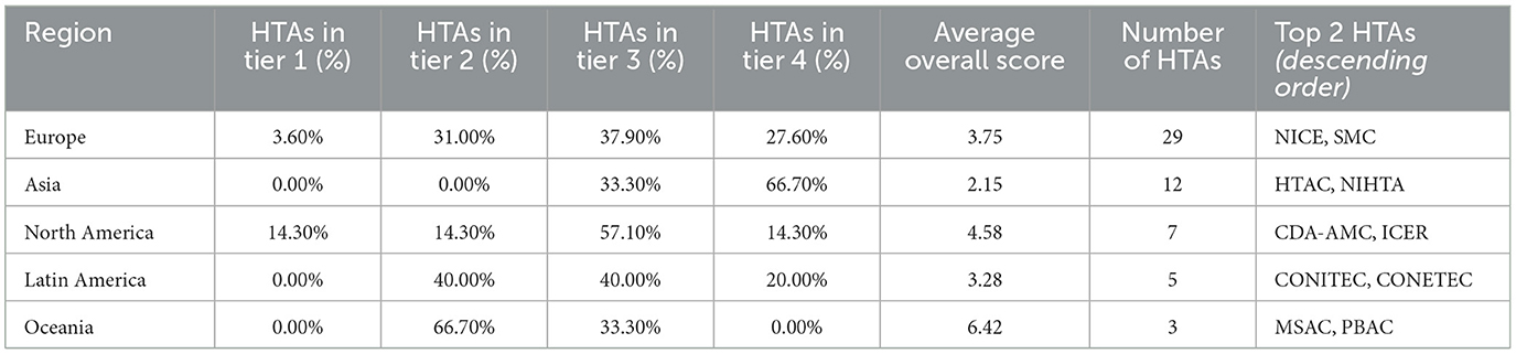In terms of the distribution of HTA systems per tier across regions, Europe hosted one Tier 1 HTA system, with the majority distributed relatively evenly across Tiers 2, 3, and 4. Asia had some HTA systems in Tier 3, and most were ranked Tier 4. North America housed one Tier 1 HTA system, with the majority falling into Tier 3. In Latin America, most HTA systems were in Tiers 2 and 3. Oceania, boasting the highest average score, had most systems in Tier 2.