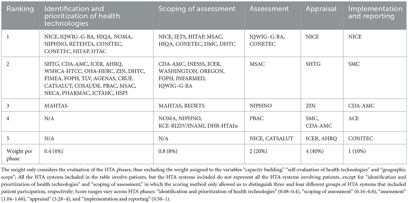 The top five HTA systems by phase based on their score per phase can be found in Table 6. In the case that more than one HTA achieved the same score for a certain phase, all those with the qualifying score were included in the same ranking group.