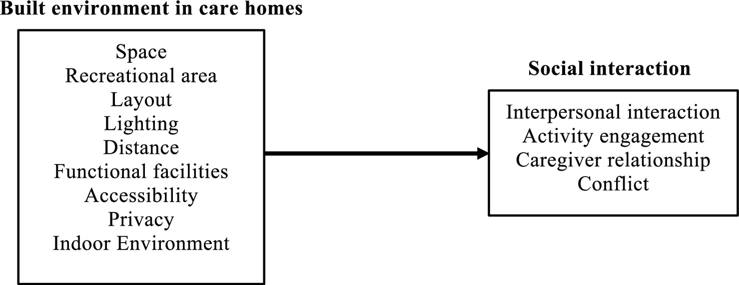 Diagram illustrating the relationship between the built environment in care homes and social interaction. The built environment includes space, recreational area, layout, lighting, distance, functional facilities, accessibility, privacy, and indoor environment. These factors connect to social interaction aspects such as interpersonal interaction, activity engagement, caregiver relationships, and conflict.