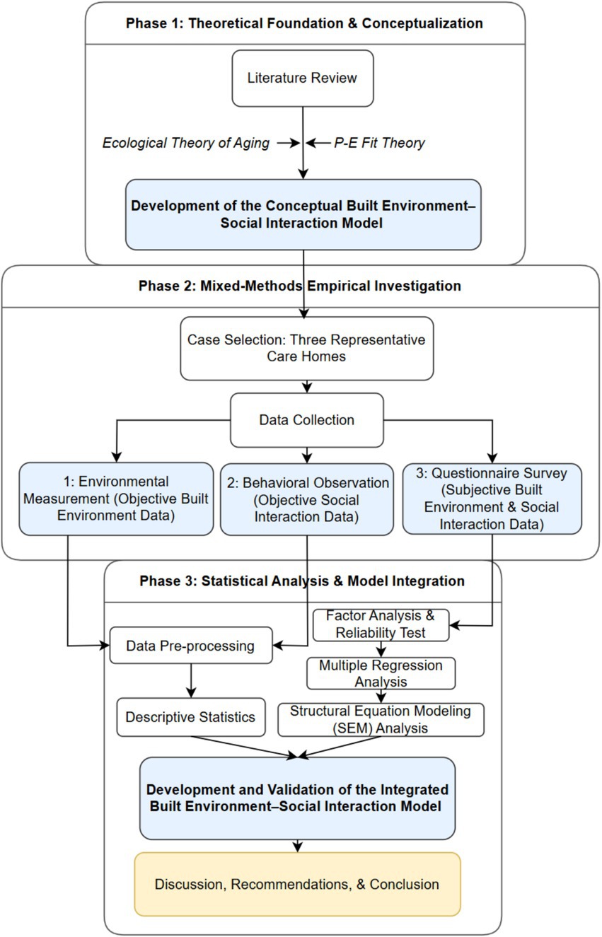 Flowchart depicting a three-phase process for developing and validating an Integrated Built Environment-Social Interaction Model. Phase 1 involves theoretical foundation and conceptualization with a literature review and development of the model using Ecological Theory of Aging and P-E Fit Theory. Phase 2 is a mixed-methods empirical investigation including case selection, data collection through environmental measurement, behavioral observation, and questionnaires. Phase 3 involves statistical analysis and model integration through data pre-processing, descriptive statistics, factor analysis, and SEM analysis, leading to model validation and final discussion.