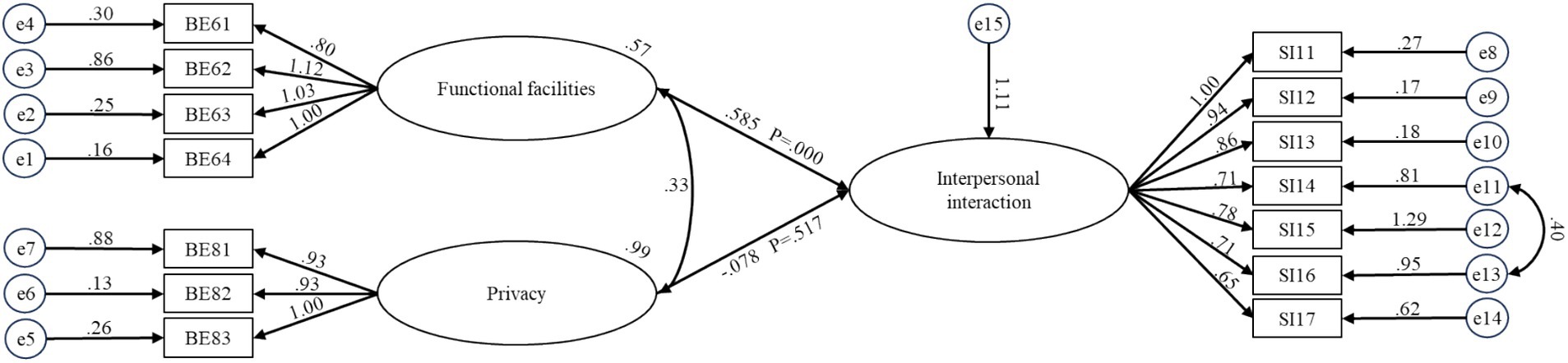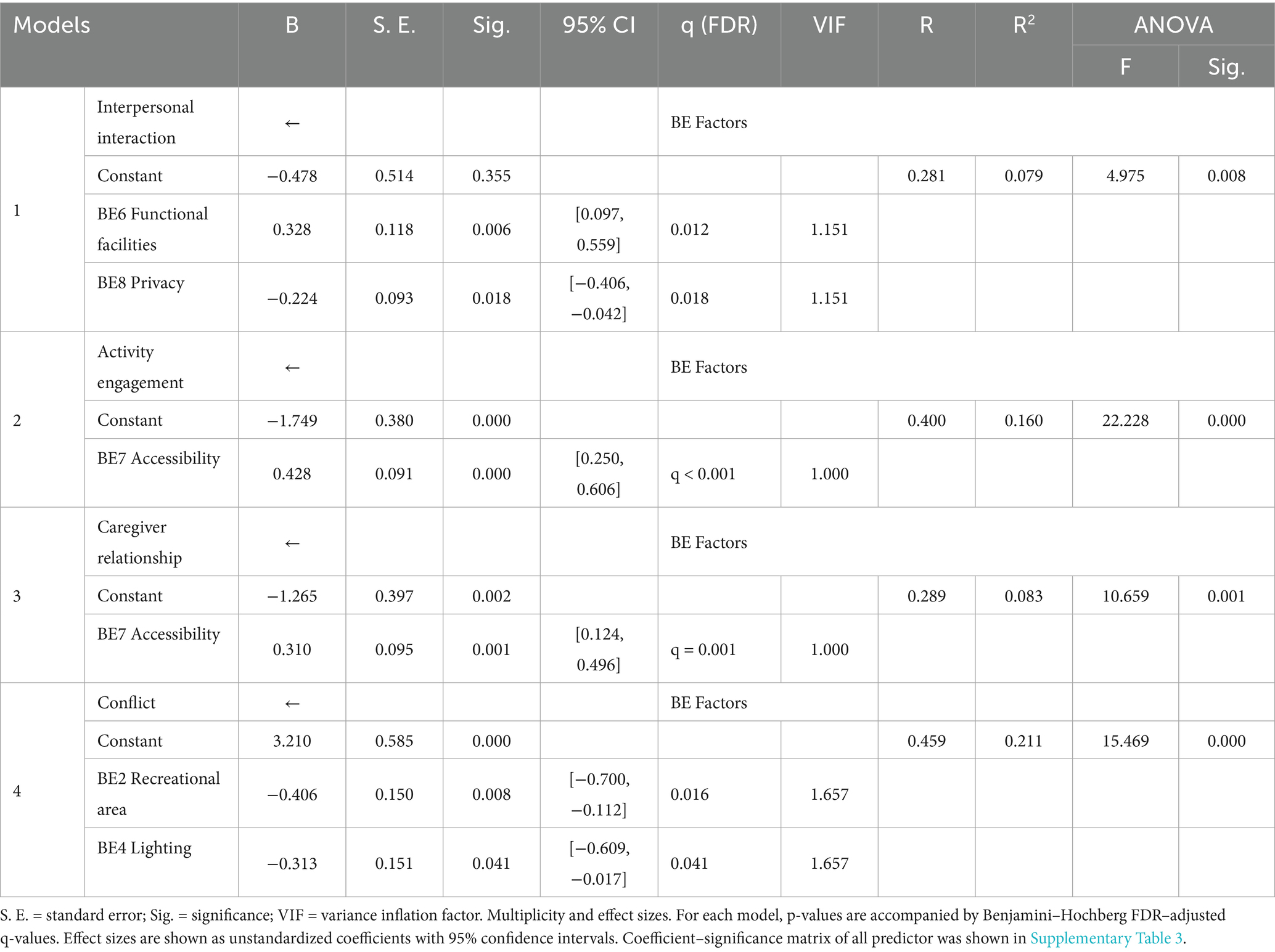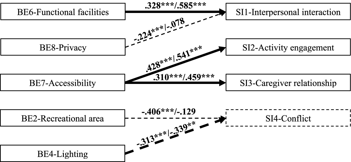 The maximum likelihood estimates for the four optimal structural equation models are presented in Figures 3-6. The results reveal the following findings: older residents’ agreement with functional facilities was found to have a positive effect on interpersonal interaction, with a standardized path coefficient of 0.585, and this relationship was statistically significant (p < 0.001) (BE6-SI1). In contrast, privacy showed a negative path coefficient of −0.078, but this relationship was not statistically significant (p = 0.517), indicating no meaningful impact on interpersonal interaction (BE8-SI1). Accessibility was positively associated with both activity engagement and caregiver relationships, with standardized path coefficients of 0.541 (p < 0.001) for activity engagement (BE7-SI2) and 0.459 (p < 0.001) for caregiver relationships (BE7-SI3). The availability of recreational areas showed an inverse relationship with conflict, with a path coefficient of −0.129, but this effect was not statistically significant (p = 0.196) (BE2-SI4). Lastly, lighting had a negative path coefficient of −0.339, which was statistically significant (p = 0.005), indicating a substantial effect on conflict (BE4-SI4). SEM structural paths with effect sizes (95% CIs) and FDR-adjusted q-values were presented in Supplementary Table 4.