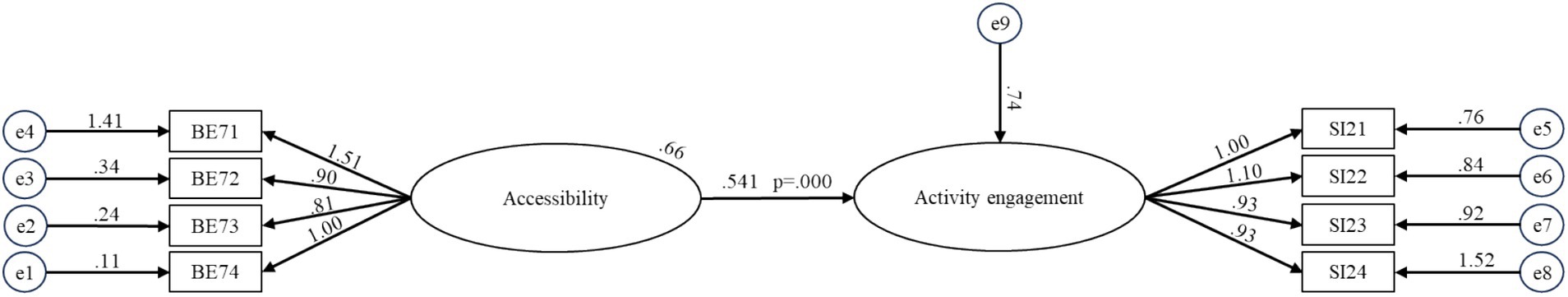 Path diagram showing the relationship between accessibility and activity engagement. Variables e1 to e4 influence BE71 to BE74, which link to the accessibility factor. Accessibility is connected to activity engagement, influenced by e9. Variables SI21 to SI24 point to activity engagement, further linked to e5 to e8. Path coefficients are shown on the arrows.