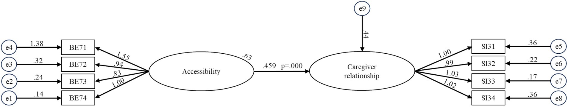 Path diagram illustrating relationships between variables. Four rectangular nodes represent BE71, BE72, BE73, BE74 connecting to an oval labeled Accessibility. Arrows indicate relationships with weights 1.55, 0.94, 0.83, and 1.00. Accessibility connects to another oval labeled Caregiver Relationship with a weight of 0.63, p-value 0.000. Four rectangular nodes opposite represent SI31, SI32, SI33, SI34, each connected back to Caregiver Relationship with weights 1.00, 0.99, 1.03, 1.02. Circular nodes labeled e1 to e9 represent error terms with weights on paths to or from them.