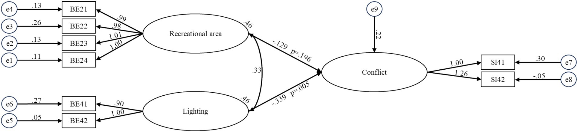 A diagram depicts relationships among variables. E1 to E6 connect to BE21 through BE42 with values like 0.13 and 0.27. These connect to two ovals labeled Recreational Area and Lighting, leading to a larger oval labeled Conflict. E9 connects to Conflict with 0.22. Conflict directs to SI41 and SI42, linked to E7 and E8 with values 0.30 and -0.05. Values and probabilities are marked on paths, such as -0.129 (p=0.196) and -0.339 (p=0.005).