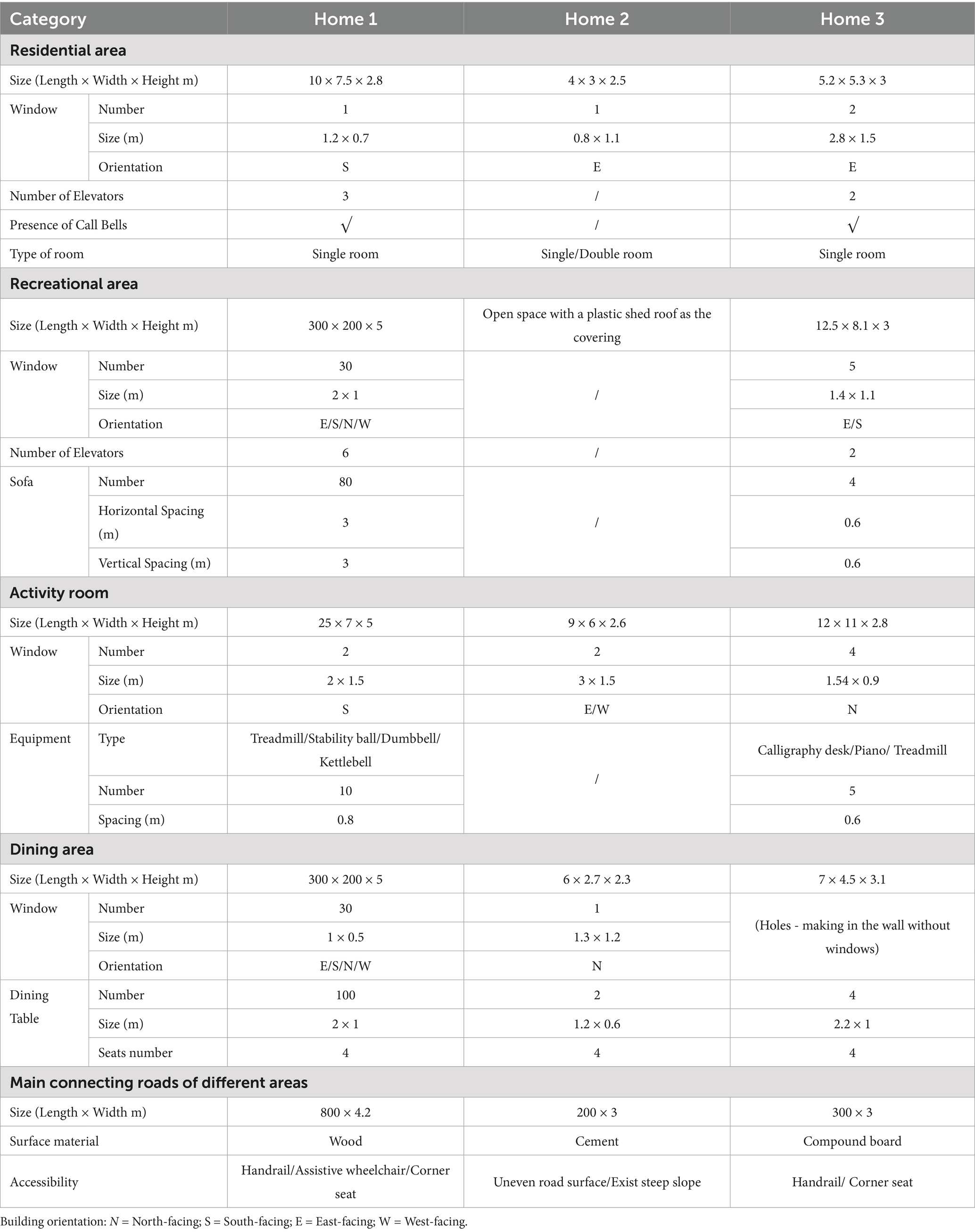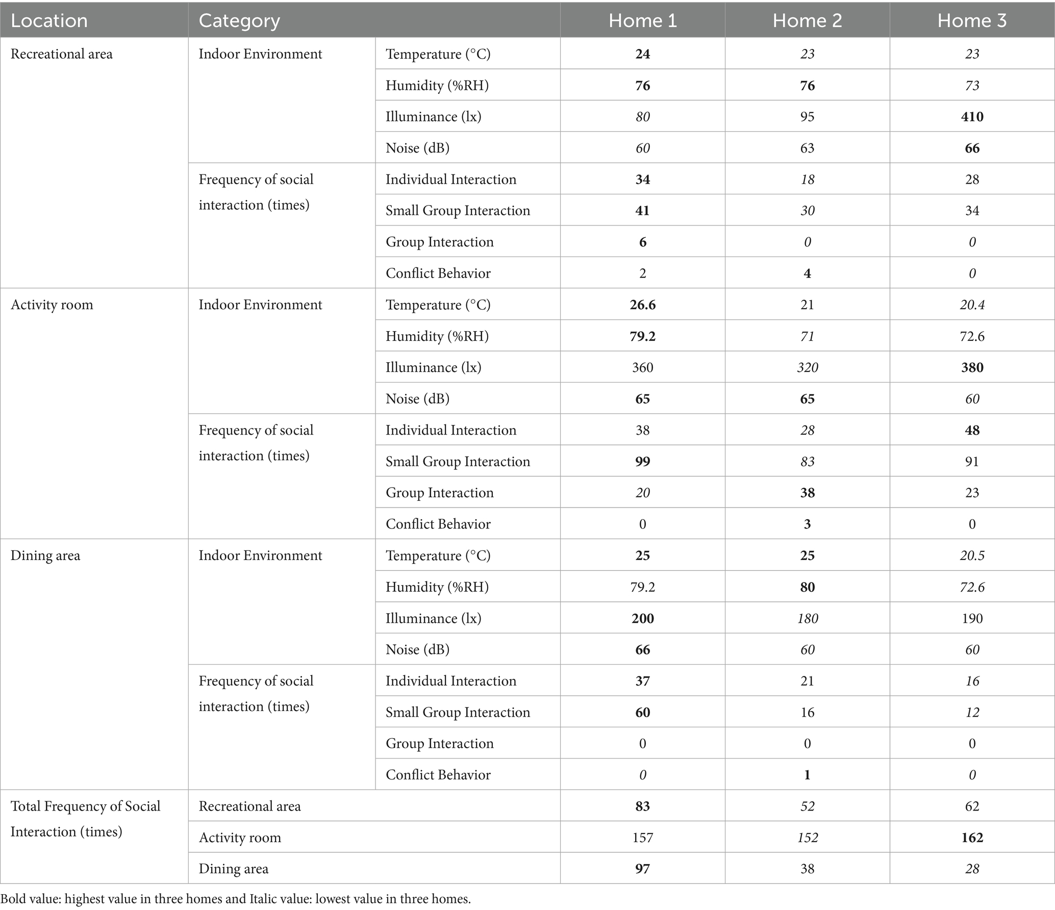 Table 1 compares environmental aspects across three care homes. Homes 1 and 3 have larger residential areas than Home 2. Home 3 features wall holes instead of traditional windows in the dining area. Home 1 has the most extensive recreational area. Regarding equipment, Home 1 contains fitness equipment, Home 3 has cultural items (calligraphy desks, pianos), while Home 2 lacks these amenities. Homes 1 and 3 are better equipped with elevators and call bells than Home 2. Comparative analysis of indoor environments and social interaction (SI) frequency within recreational areas, activity rooms, and dining areas revealed that Home 1 demonstrated higher Total Frequency of SI compared to Homes 2 and 3 (Table 2). The floor plans of the three care homes were briefly mapped out in this study to provide a clearer overview of the spatial structure (see Supplementary Figure 1).